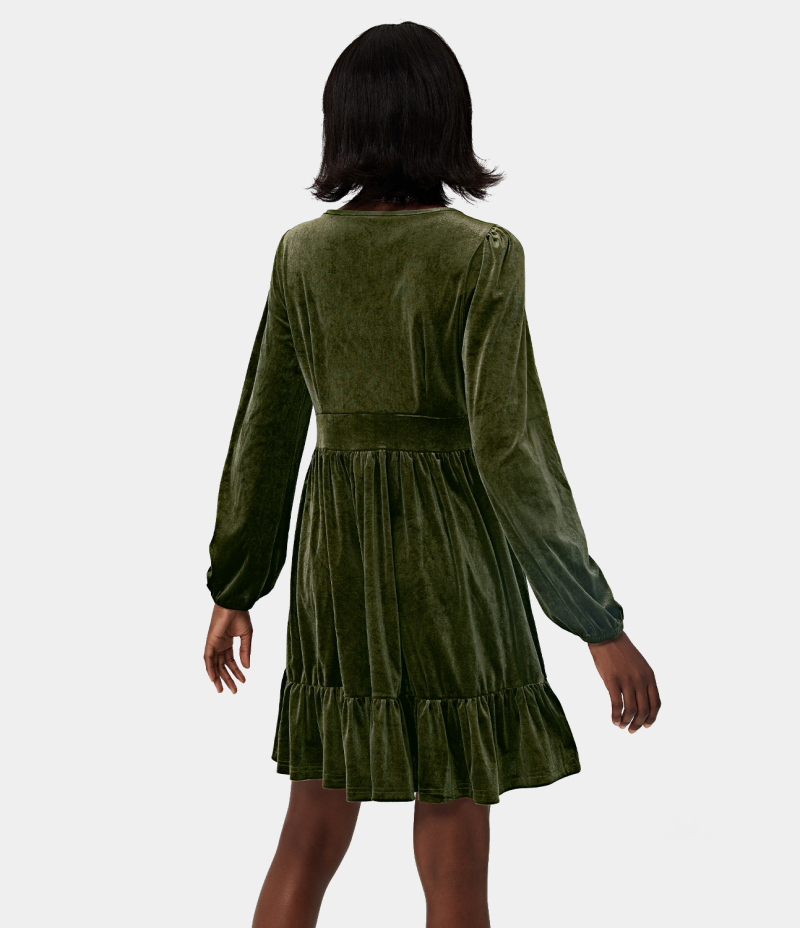 :: Halara Everyday Deep V Neck Ruffled Hem Velvet Mini Chill Women's Dress Rifle Green | 147695-HVY