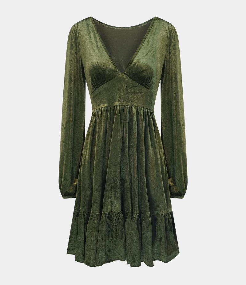 :: Halara Everyday Deep V Neck Ruffled Hem Velvet Mini Chill Women's Dress Rifle Green | 294586-ZEI