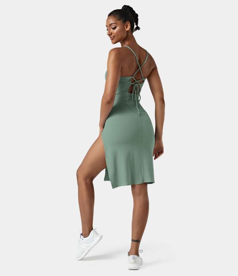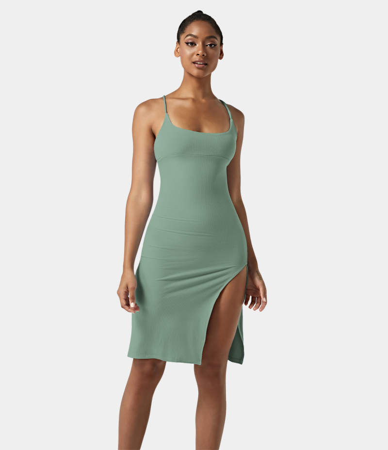 :: Halara Everyday Split Strap Bodycon Midi Chill-Sensational Women's Dress Granite Green | 280357-UXB