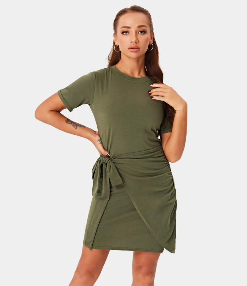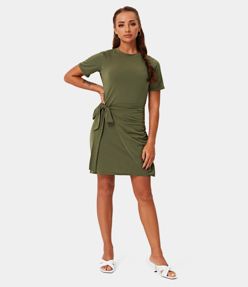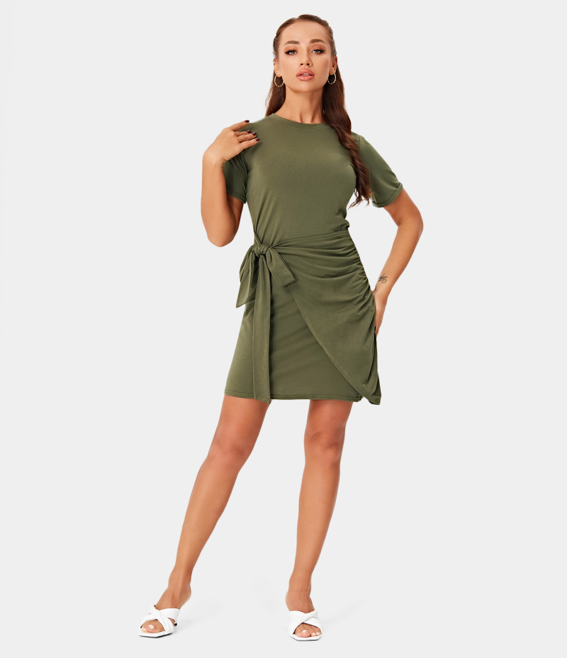 :: Halara Everyday Tie Knot Ruched Mini Chill-Belle Women's Dress Army Green | 691720-EDR