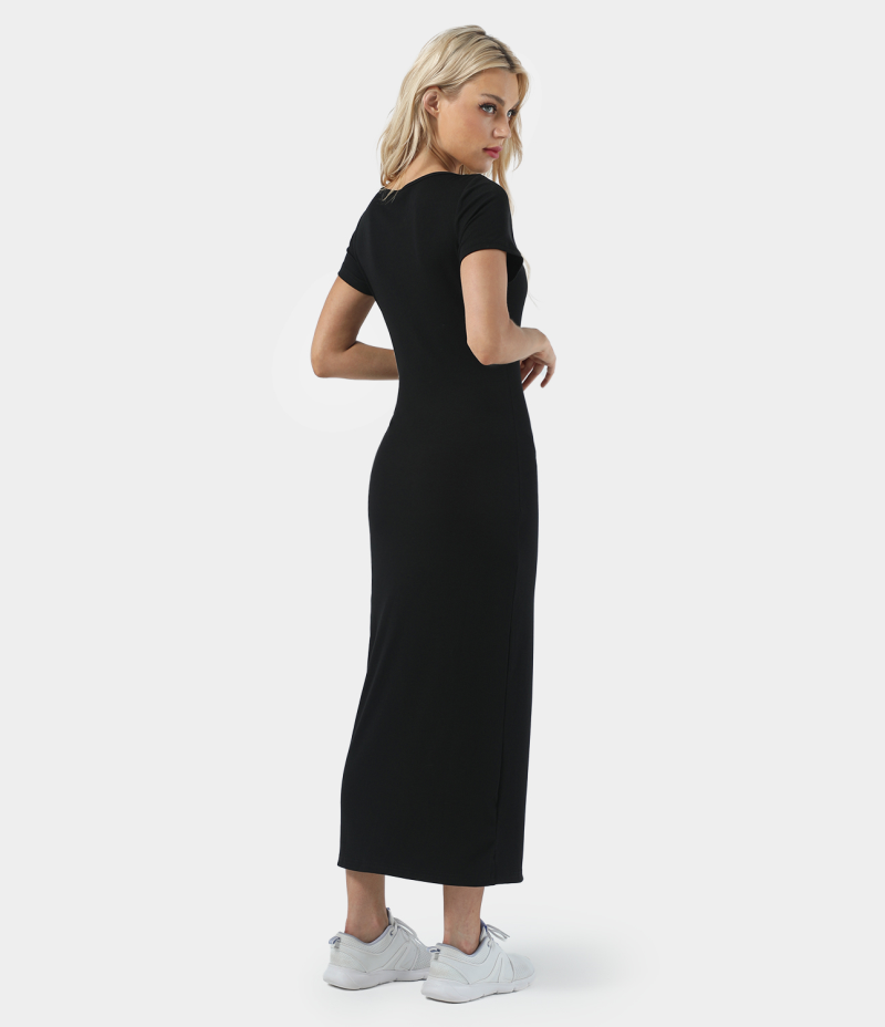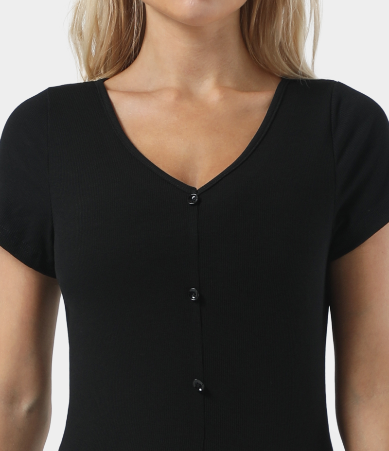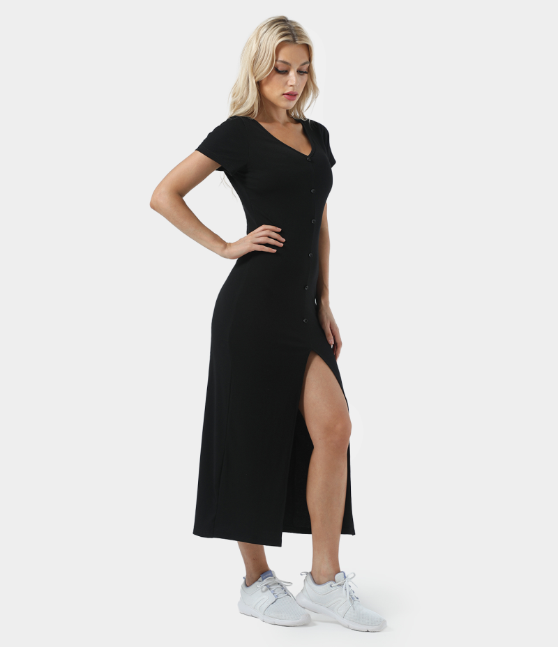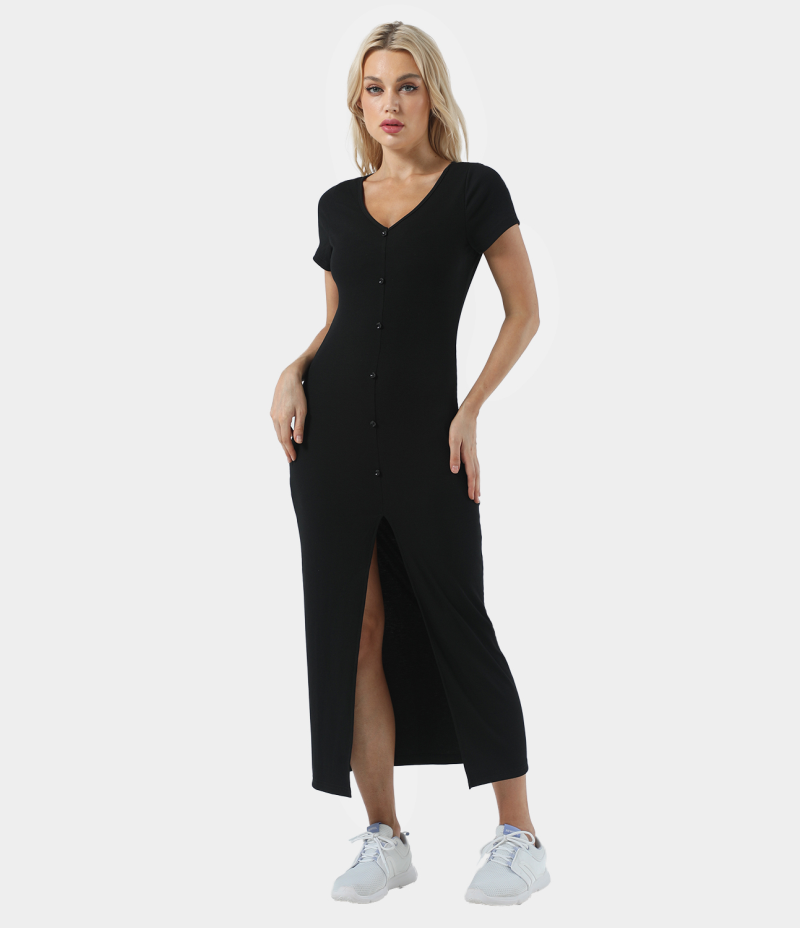 :: Halara Everyday V Neck Button Split Ribbed Knit Midi Chill Women's Dress Black | 734089-IDO