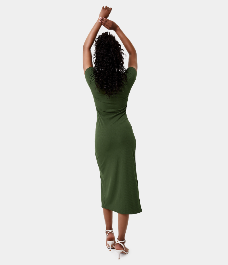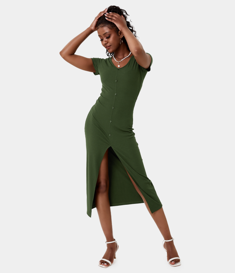 :: Halara Everyday V Neck Button Split Ribbed Knit Midi Chill Women's Dress Midnight Green | 150437-WTV