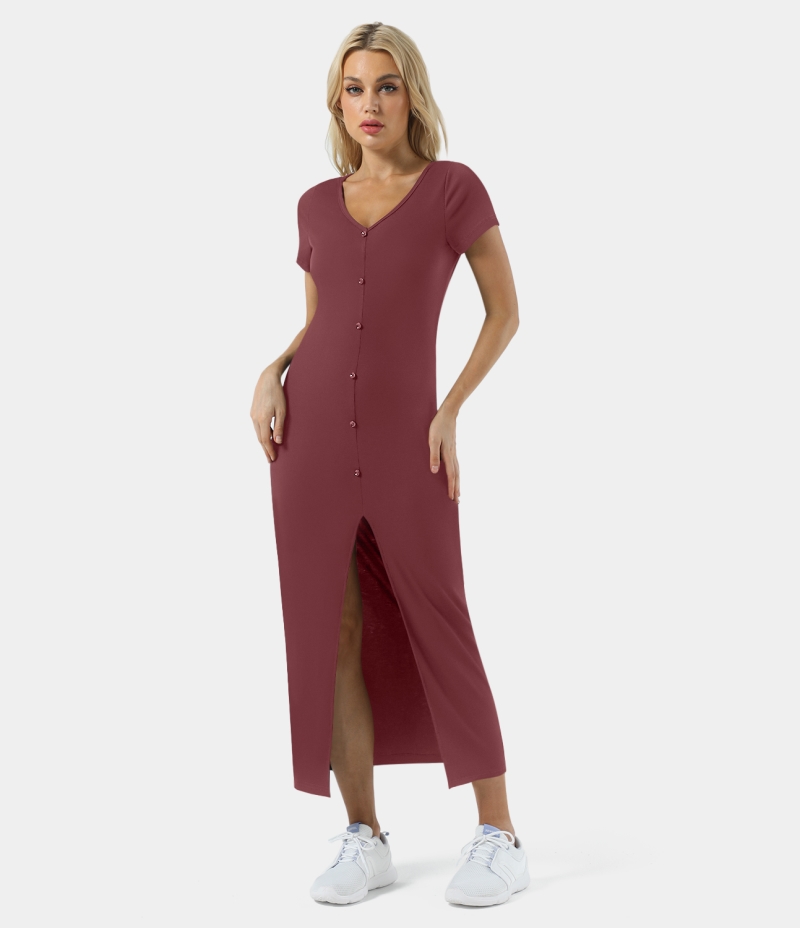 :: Halara Everyday V Neck Button Split Ribbed Knit Midi Chill Women's Dress Pomegranate | 894263-QAK