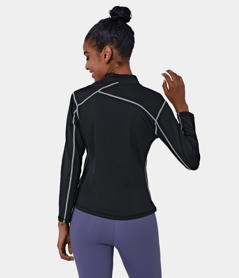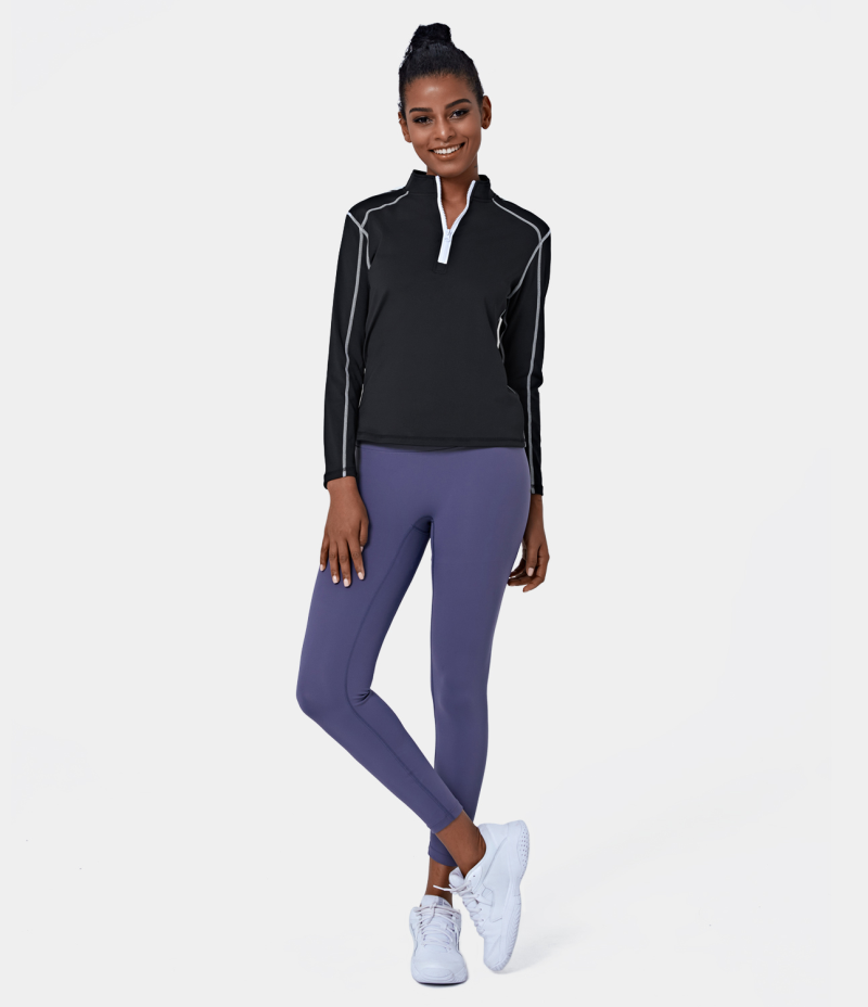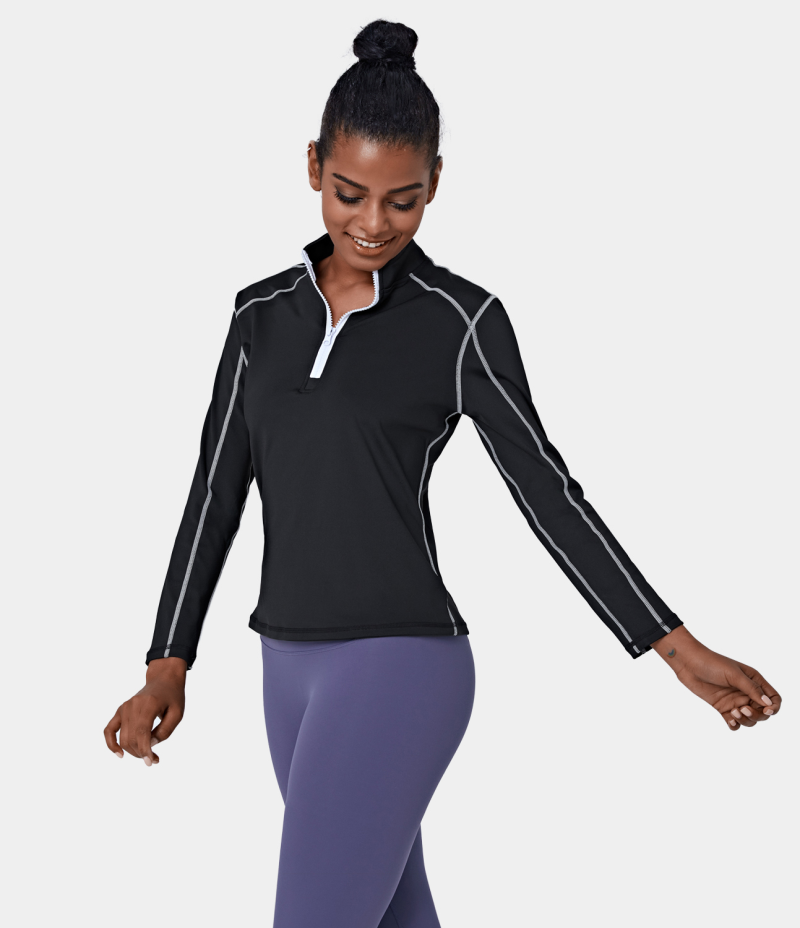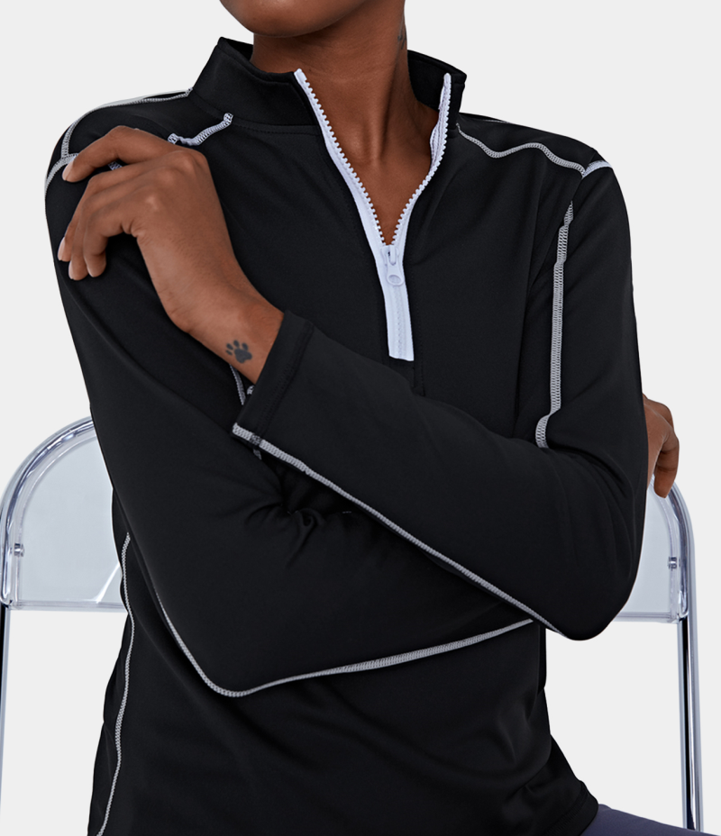 :: Halara Funnel Neck Half Zip Contrast Stitch Sports Women's Tops Black | QWFDHTG-65
