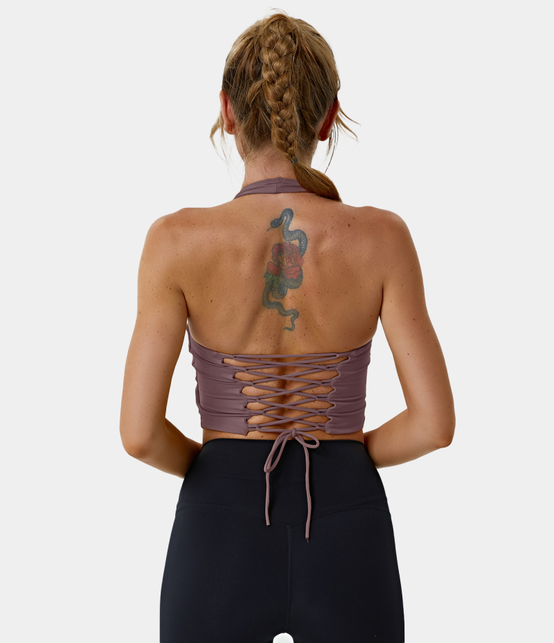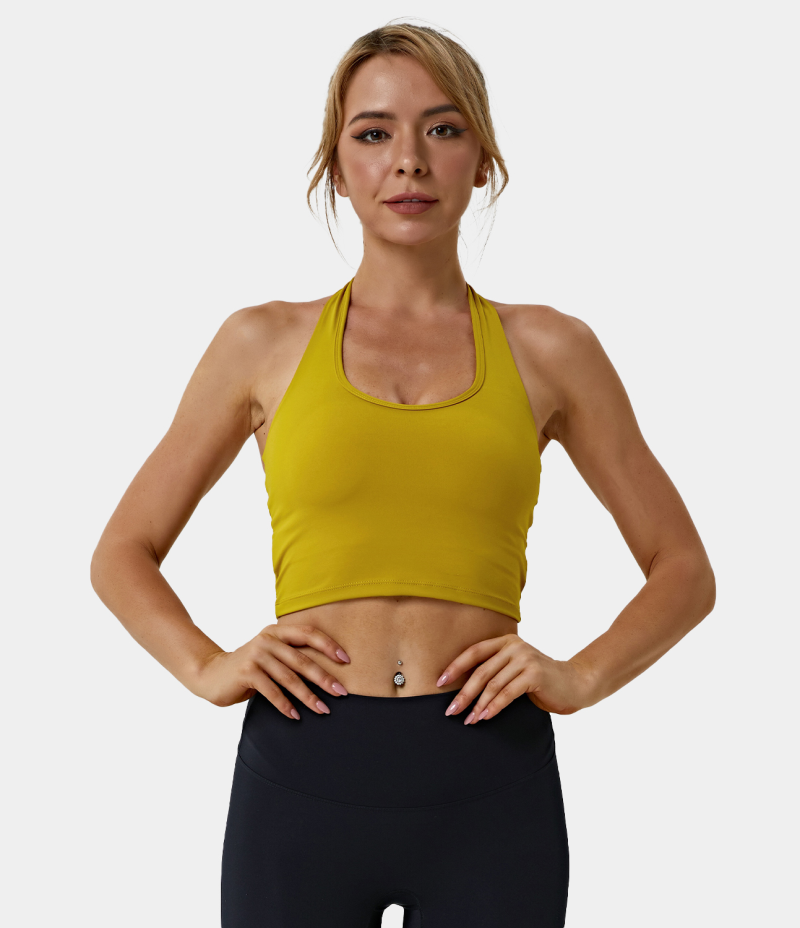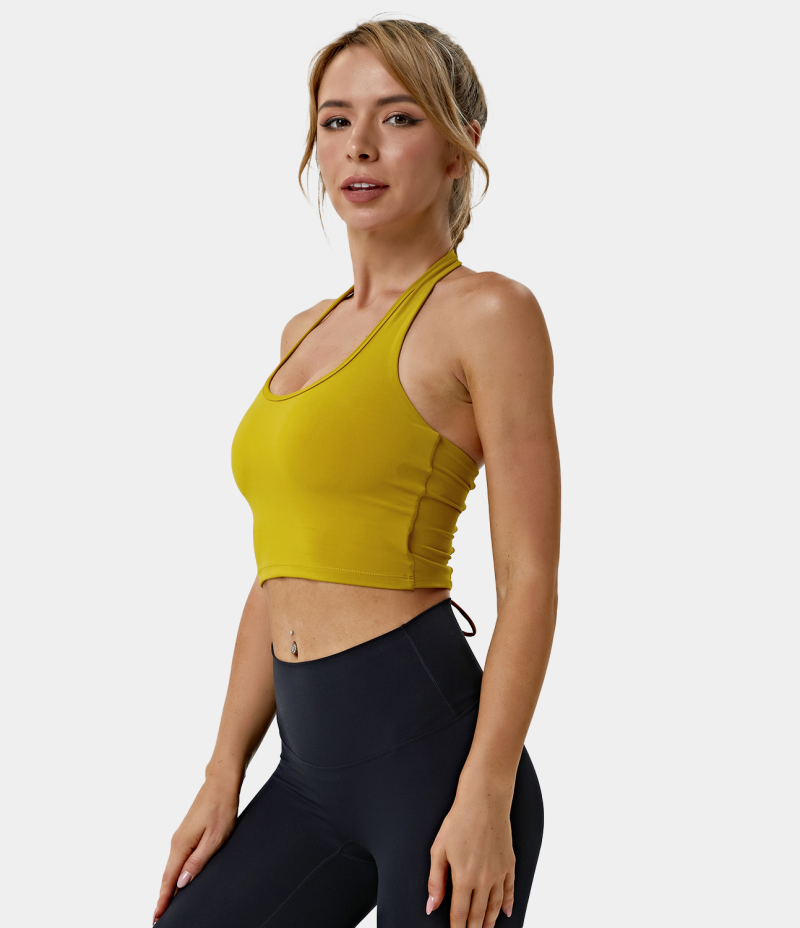 :: Halara Halter Backless Crisscross Lace Up Workout Cropped Tank Women's Tops Goldenrod | WVMSLBU-31