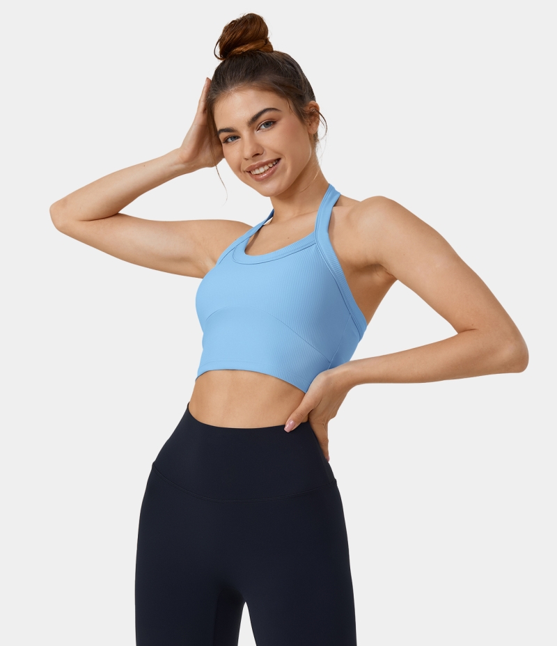 Halara Halter Backless Solid Yoga Sports Bra Women's Tops Bright Blue | AYMTRHX-85