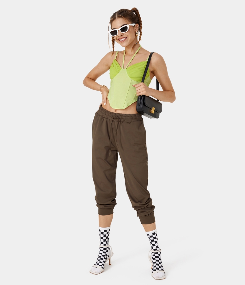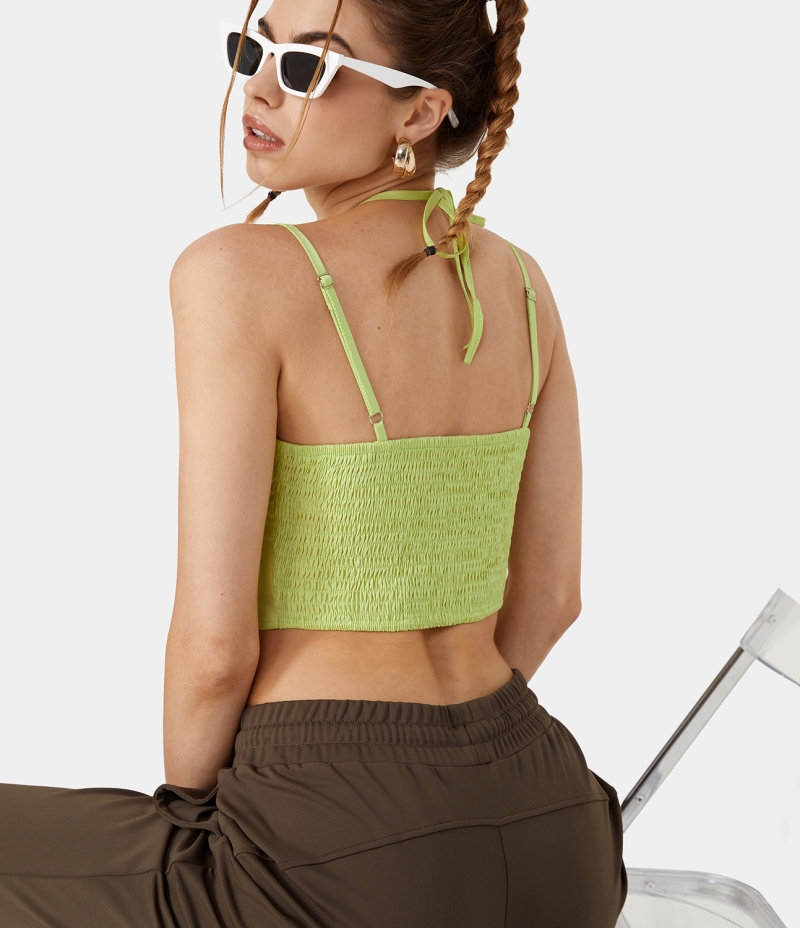 :: Halara Halter Lace Up Adjustable Strap Shirred Cropped Tank Women's Tops Lettuce Green | DUOLEXW-46