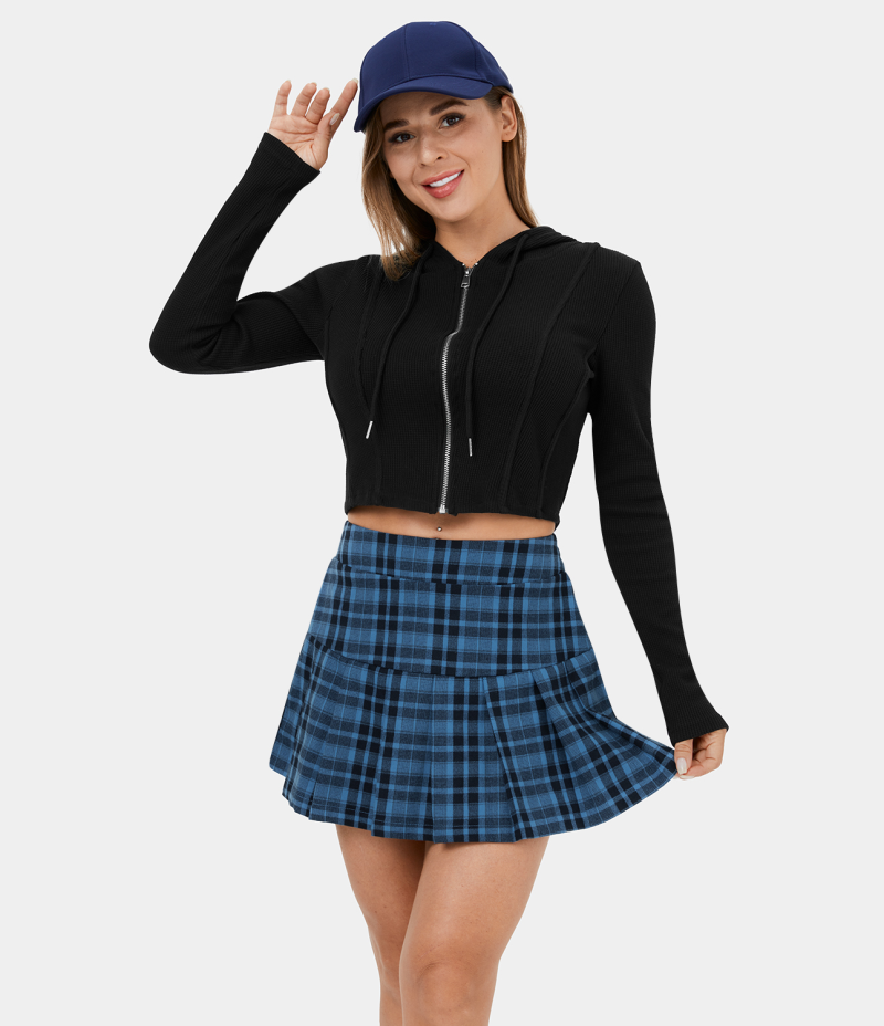 :: Halara High Waisted 2-in-1 Plaid Pleated Mini Casual Women's Skirts Dark Blue Plaid | 834691-KNH