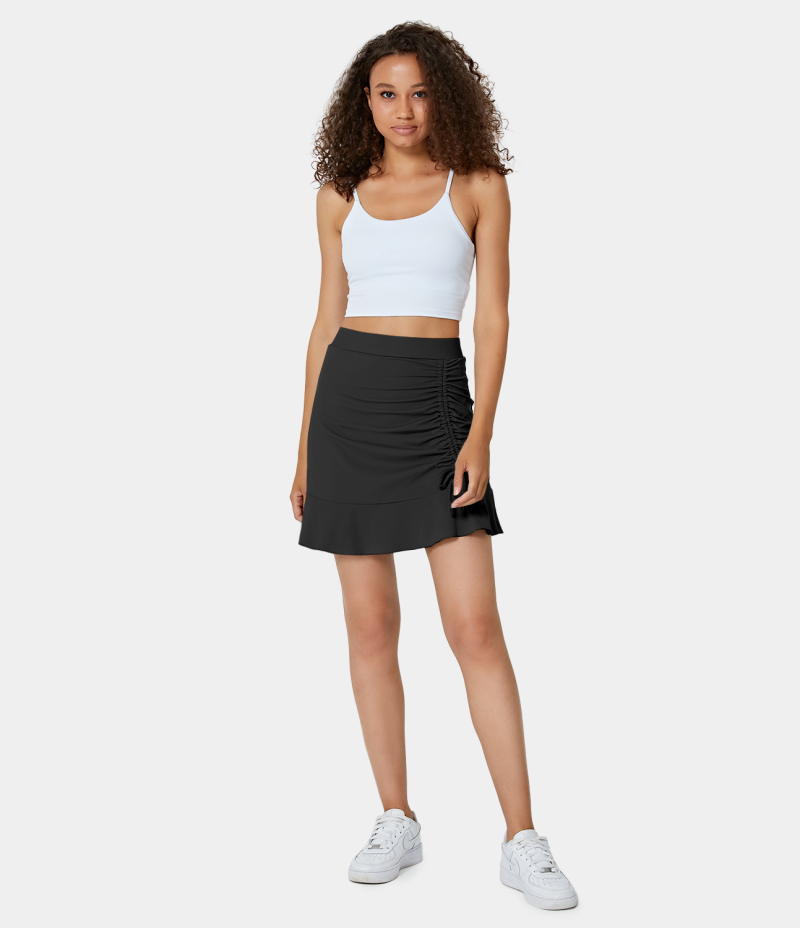 Halara High Waisted 2-in-1 Side Drawstring Pocket Plain Flare Women's Skirts Black | 135846-ZXN