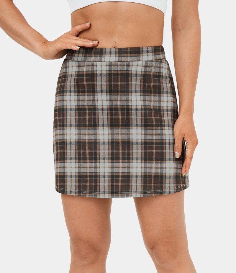 :: Halara High Waisted 2-in-1 Side Pocket Plaid A Line Mini Casual Women's Skirts Brown Plaid | 934275-ZXS