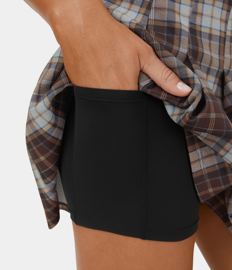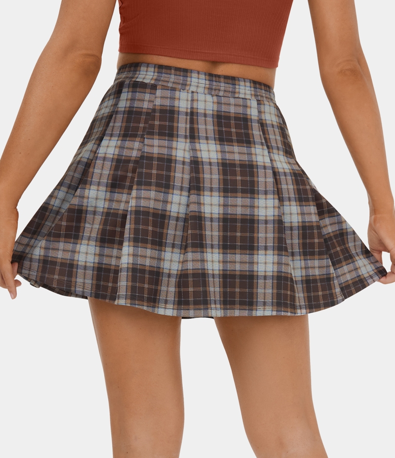 :: Halara High Waisted 2-in-1 Side Pocket Plaid Pleated Mini Casual Women's Skirts Brown Plaid | 916827-COE