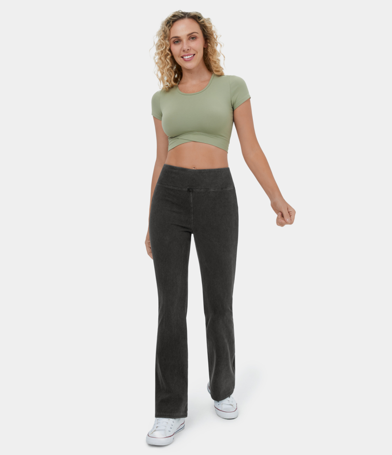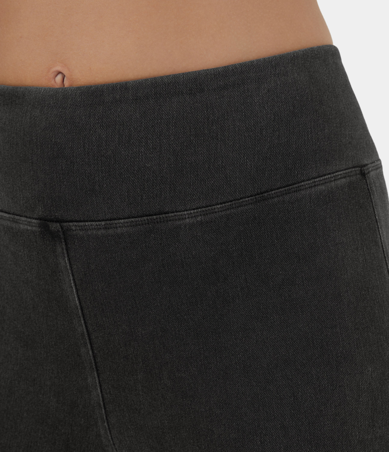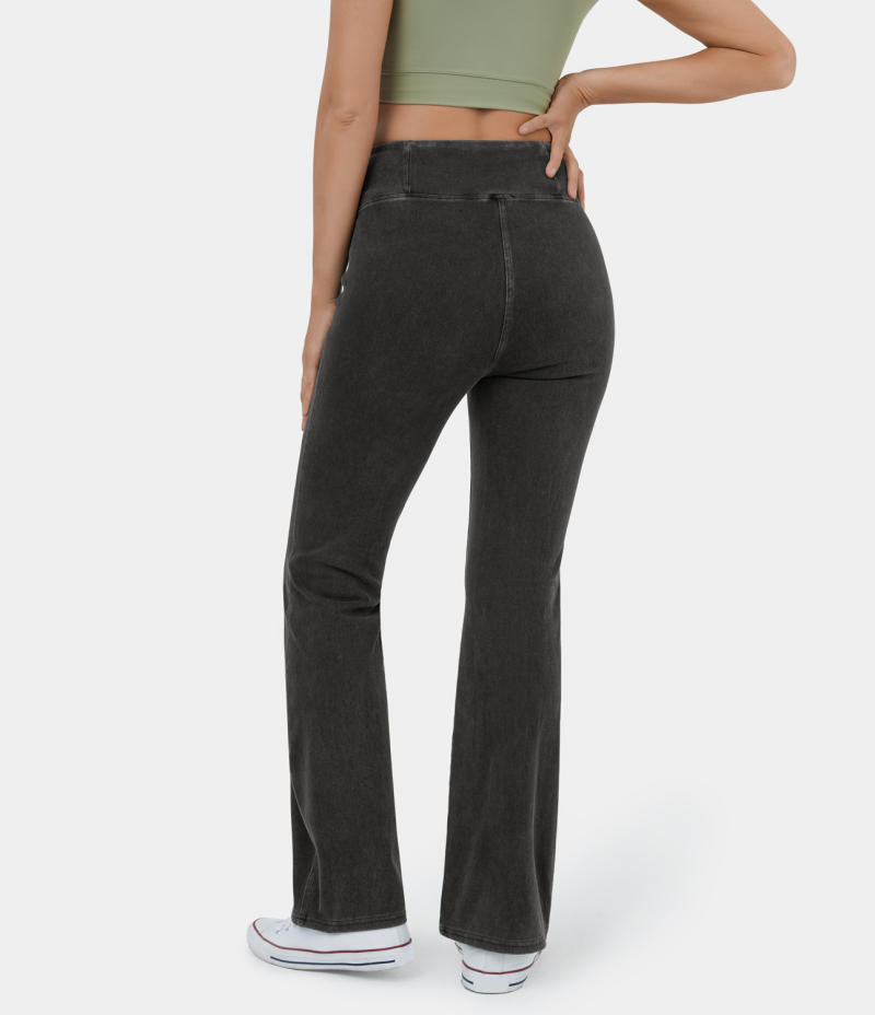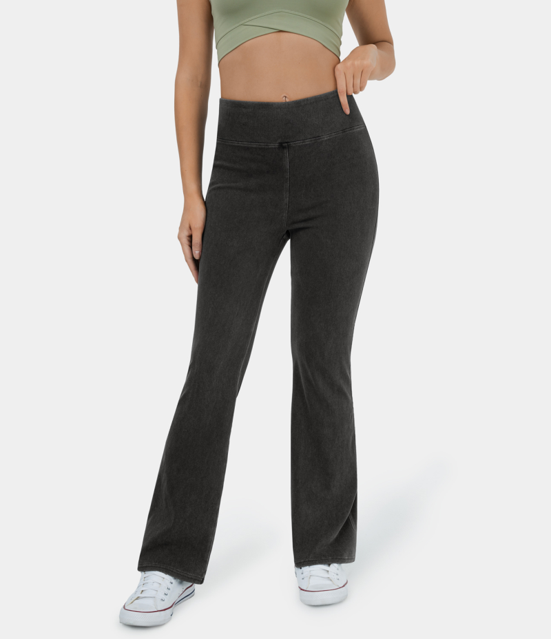 :: Halara High Waisted Back Pocket Washed Stretchy Knit Denim Slight Flare Women's Pants Washed Denim Black | 359760-EKB