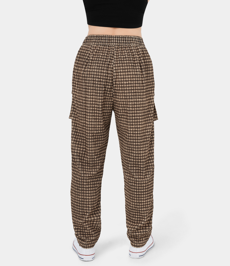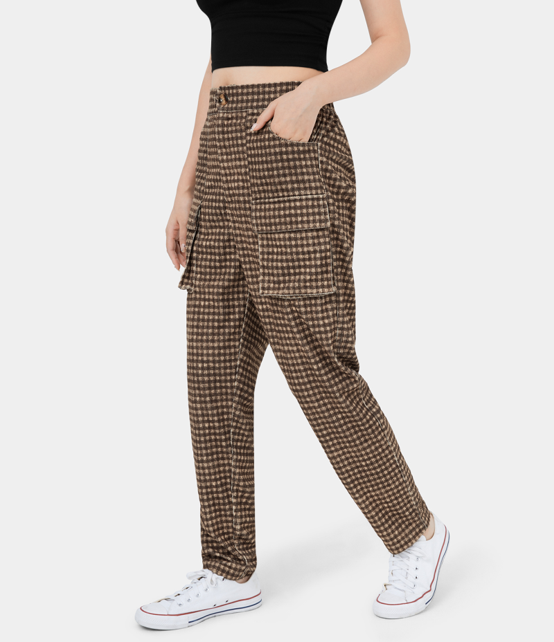 :: Halara High Waisted Button Zipper Flap Pocket Plaid Corduroy Casual Cargo Women's Pants Dark Brown Plaid | 863709-WAR
