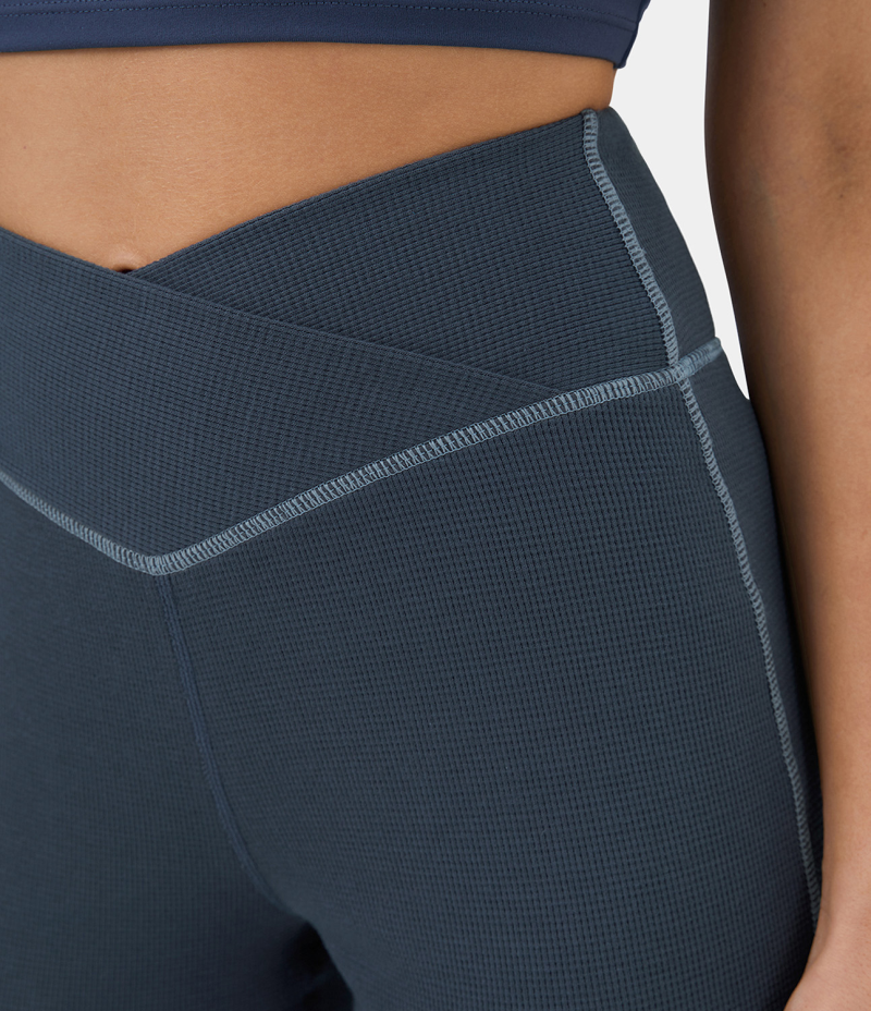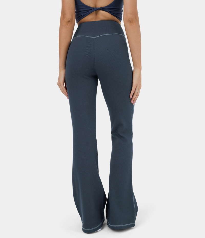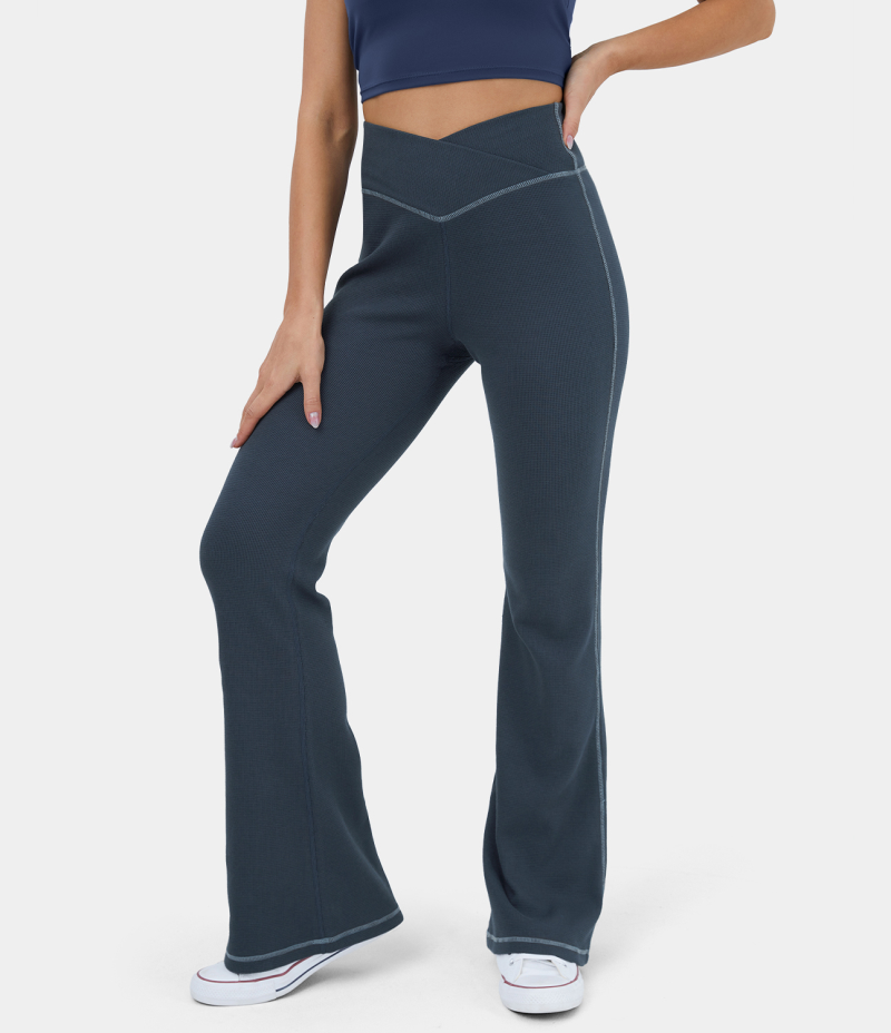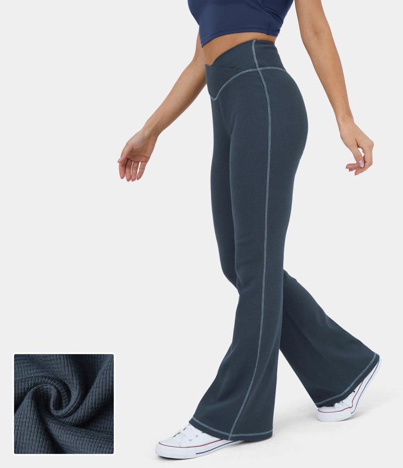 :: Halara High Waisted Crossover Contrast Trim Waffle Casual Flare Women's Leggings Dark Slate | 280157-VDS
