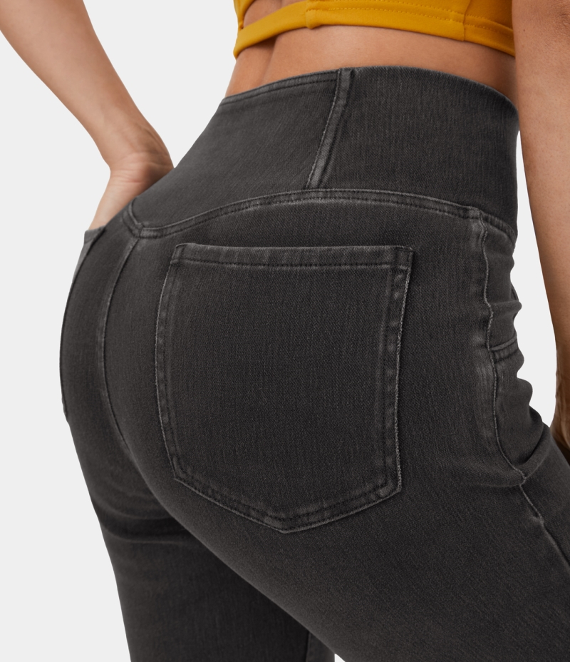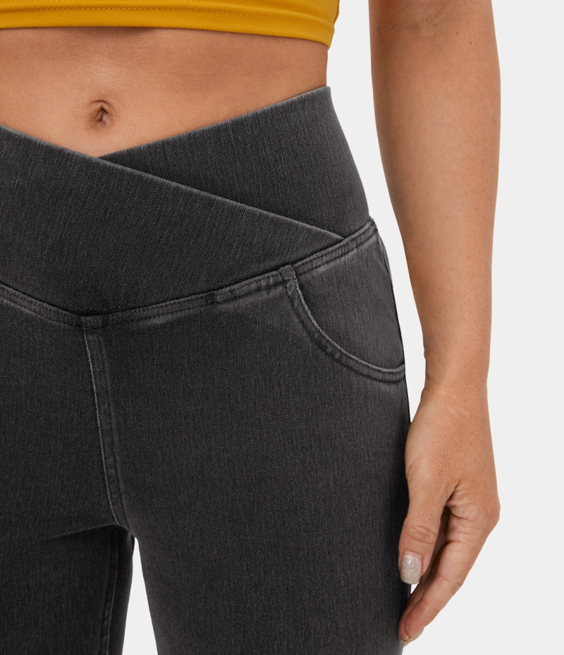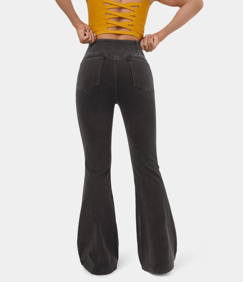 :: Halara High Waisted Crossover Pocket Washed Stretchy Knit Denim Casual Super Flare Women's Pants Washed Denim Black | 391754-PYO