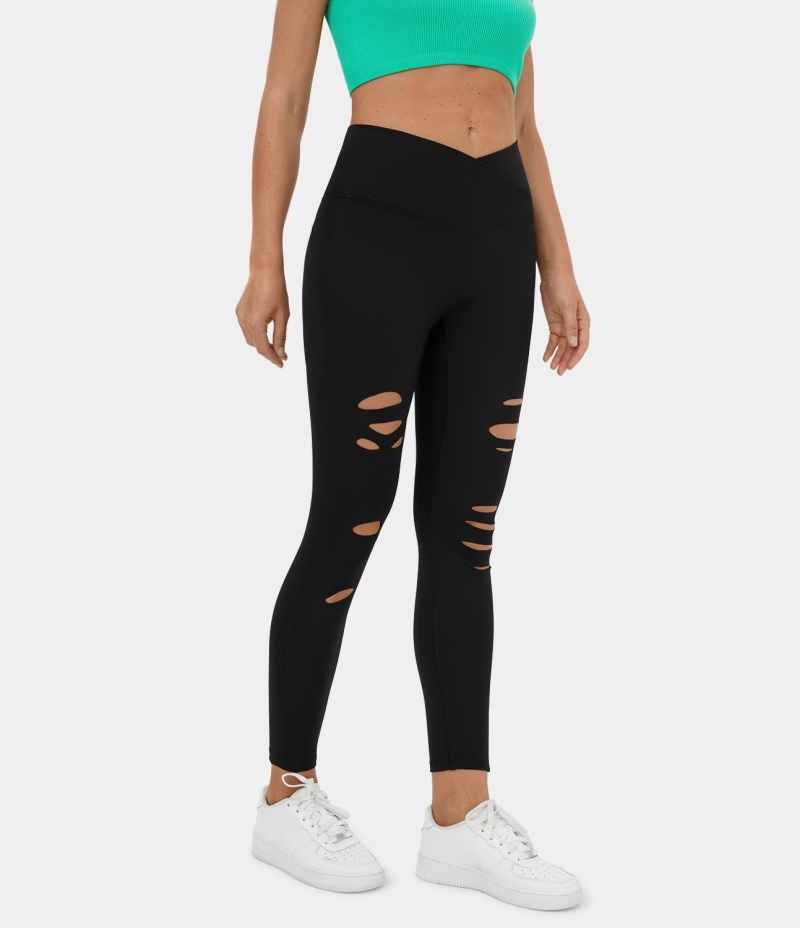 :: Halara High Waisted Crossover Side Pocket Ripped Cut Out Casual 7/8 Women's Leggings Black | 980537-ZJF