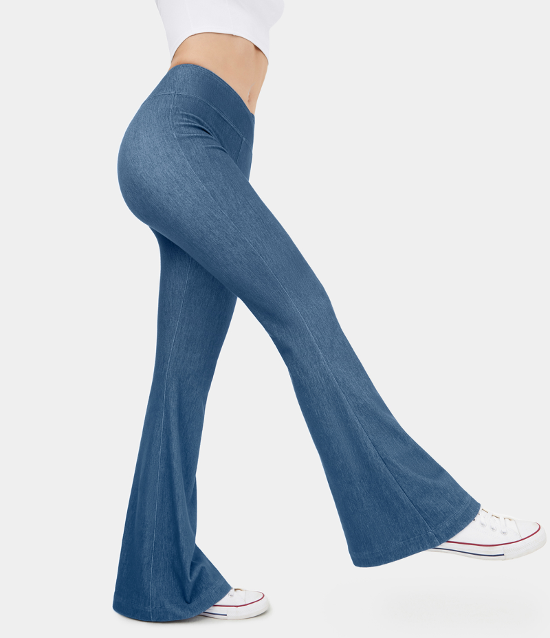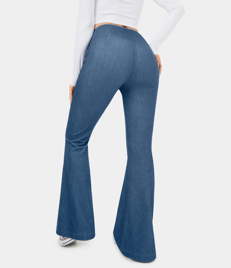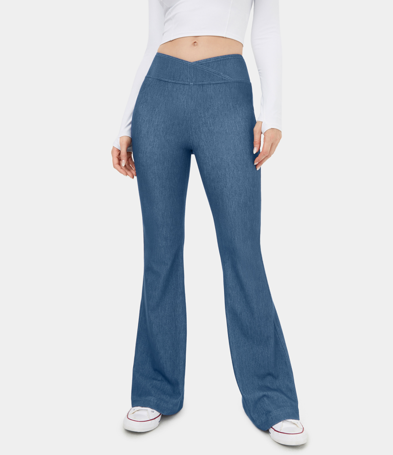 :: Halara High Waisted Crossover Stretchy Knit Denim Casual Flare Women's Pants Paeonia Ocean Blue | 312578-DWR