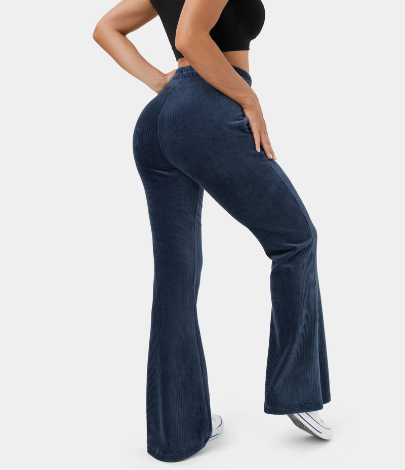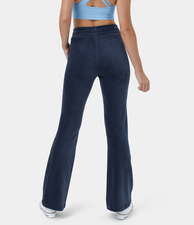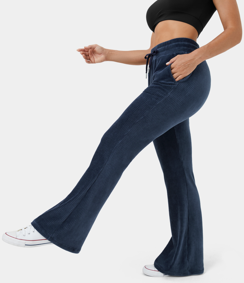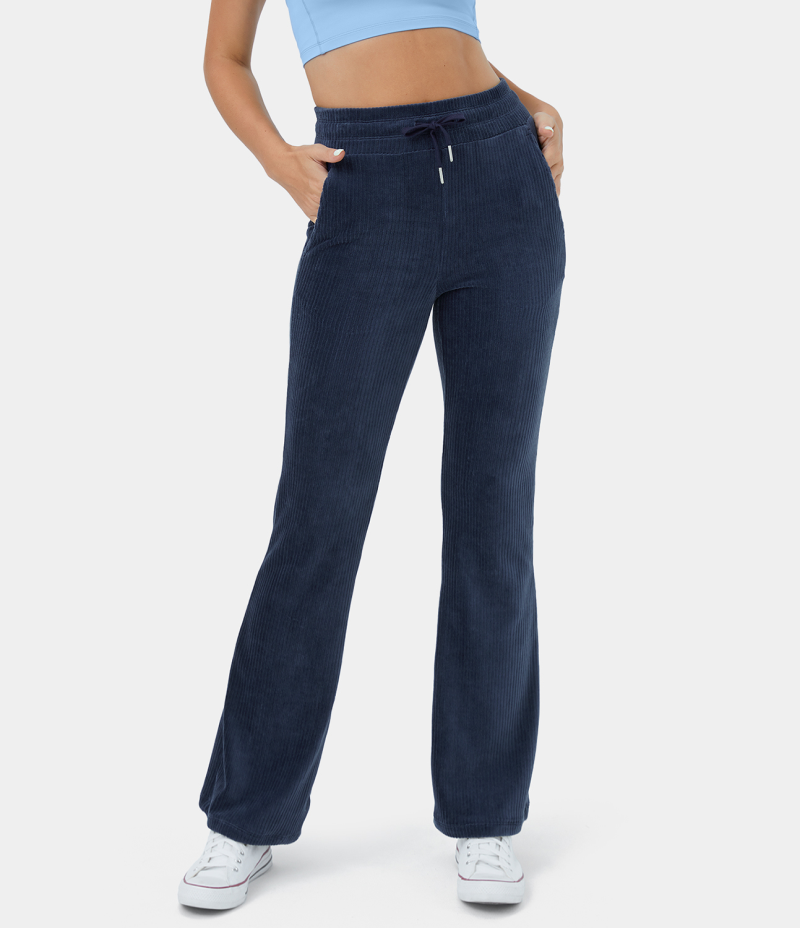 :: Halara High Waisted Drawstring Side Pocket Flare Casual Corduroy Women's Pants Dark Blue | 721830-ONJ