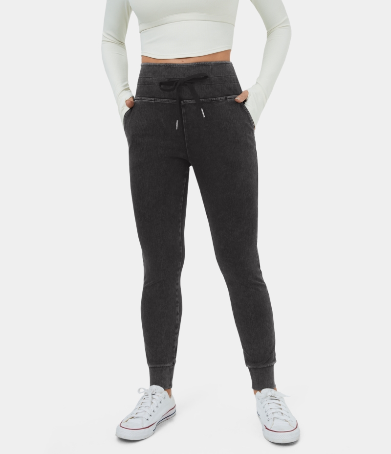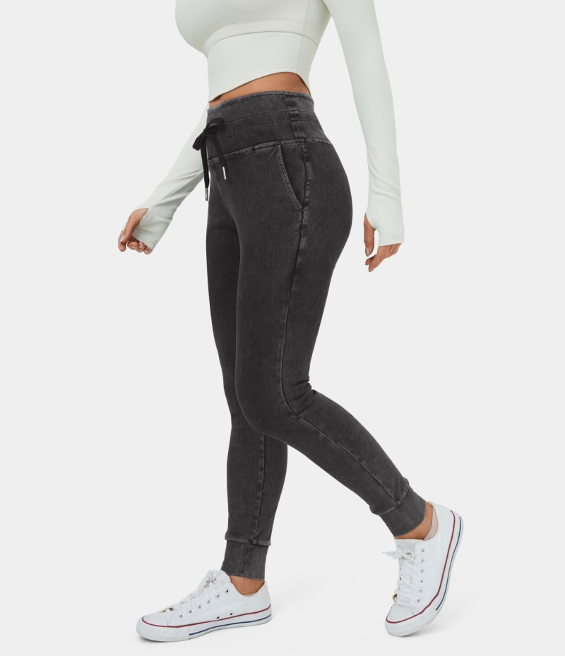 :: Halara High Waisted Drawstring Side Pocket Washed Stretchy Knit Denim Casual Women's Jogger Washed Denim Black | 271450-DBW