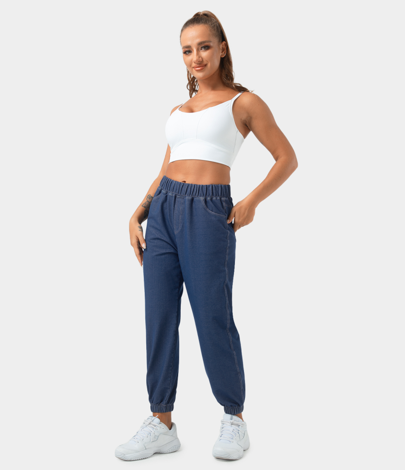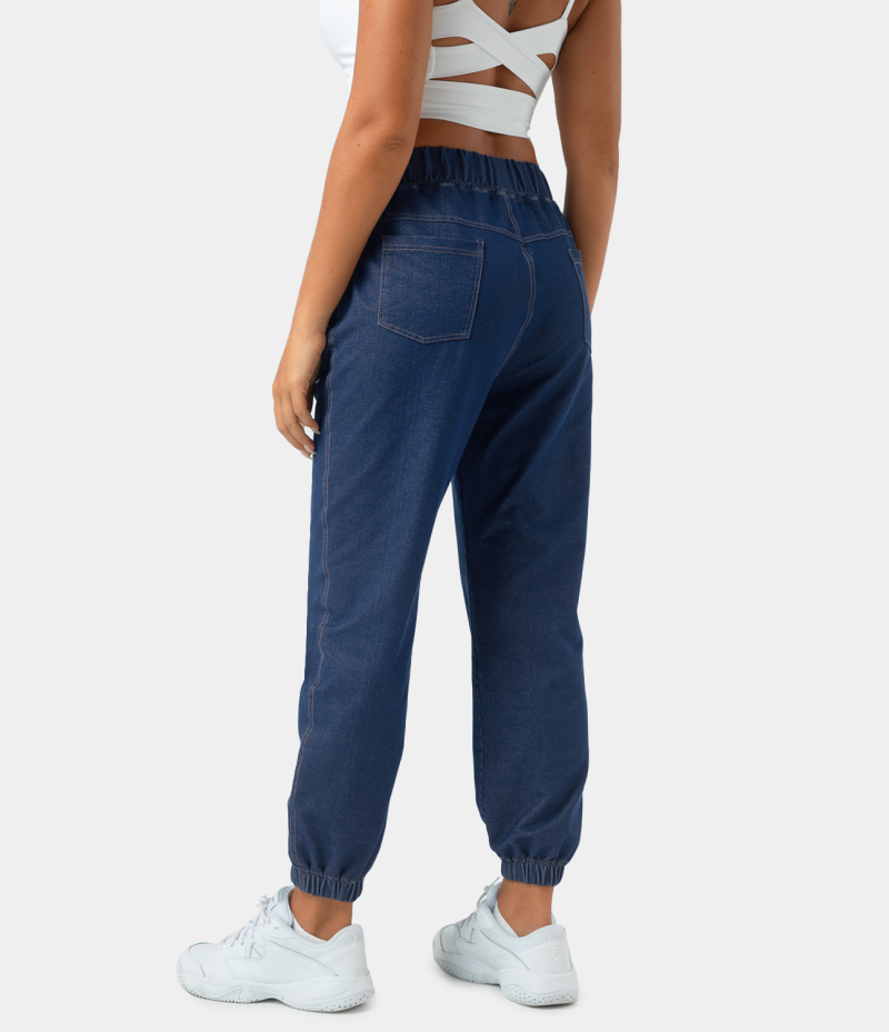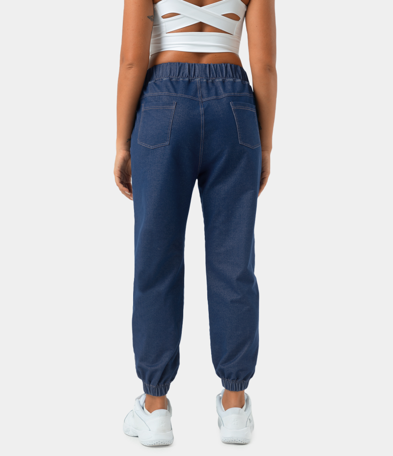 :: Halara High Waisted Elastic Waistband Side Pocket Denim Women's Pants Persian Blue | 147295-KPW