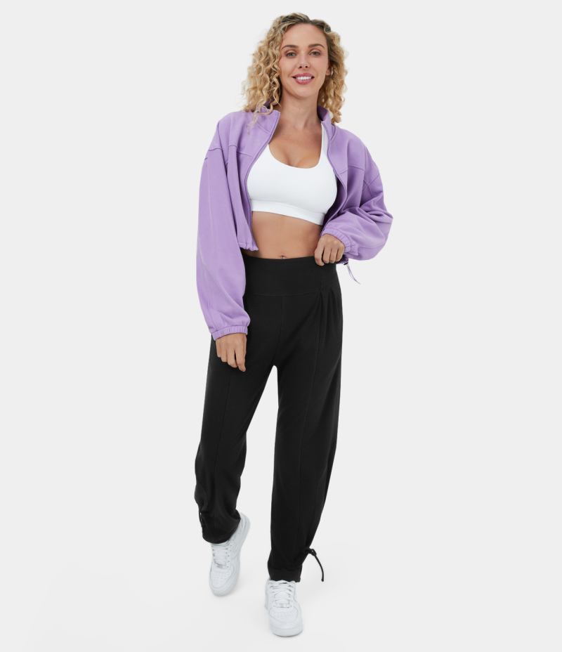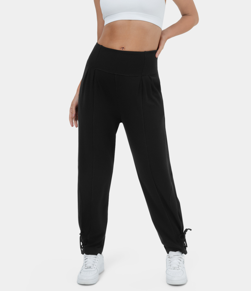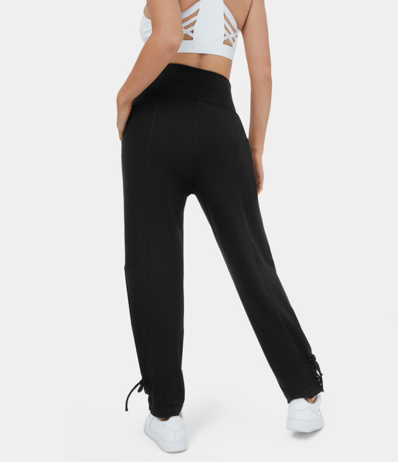 :: Halara High Waisted Foldover Ruched Side Pocket Lace Up Fleece Harem Casual Women's Pants Black | 249837-QFY