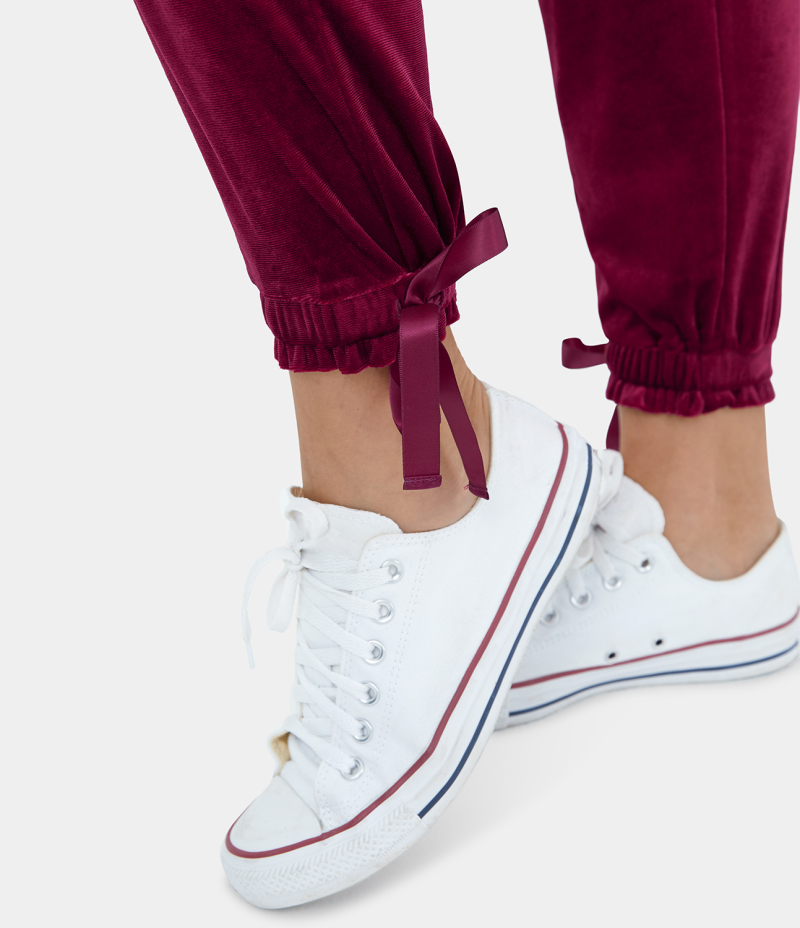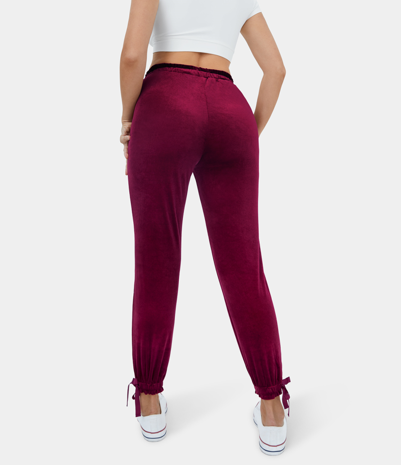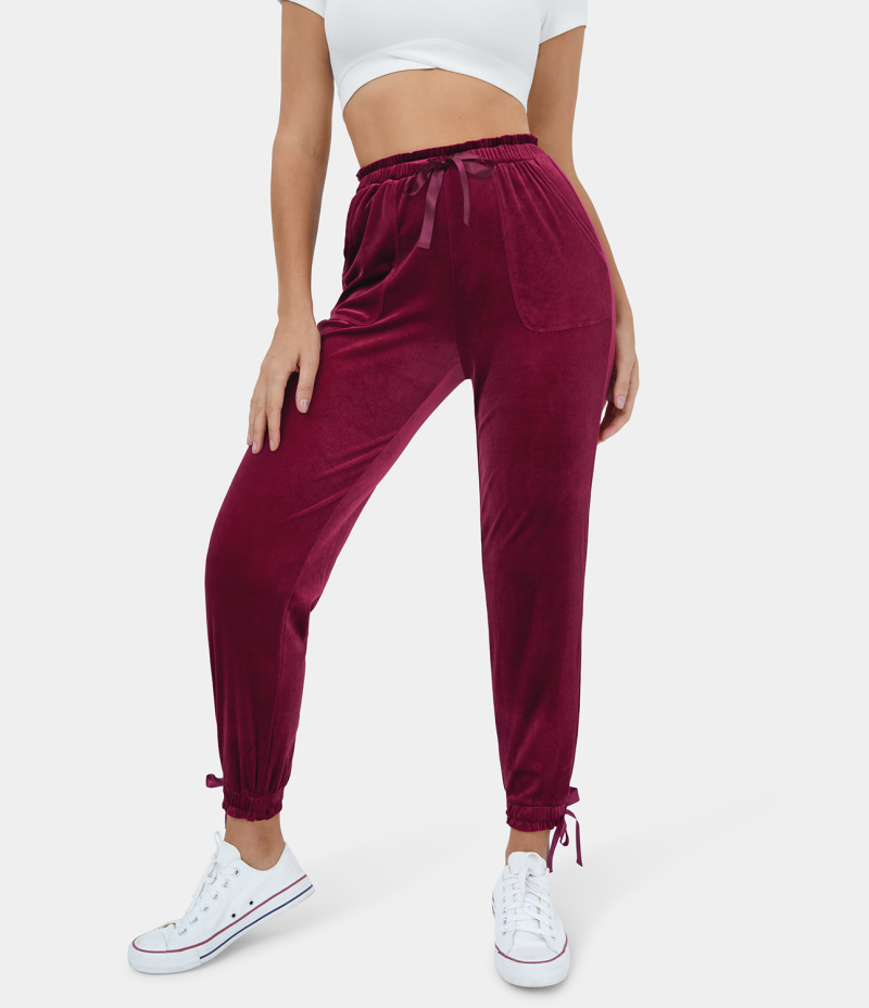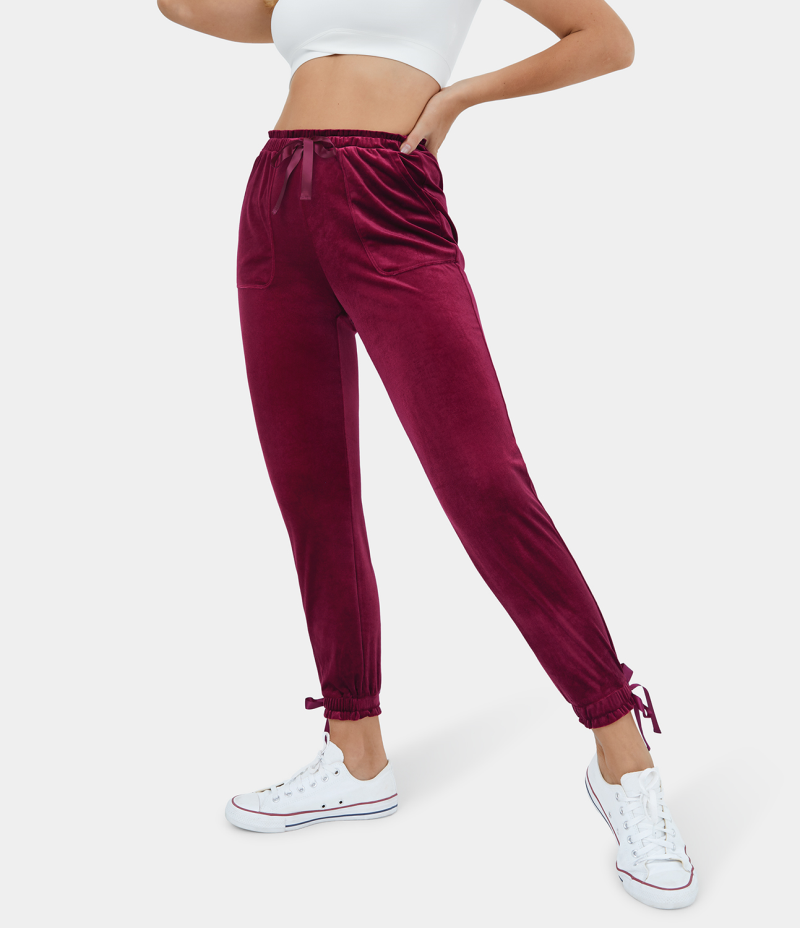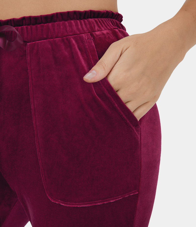 :: Halara High Waisted Frill Drawstring Side Pocket Velvet Casual Women's Pants Biking Red | 849612-QSH