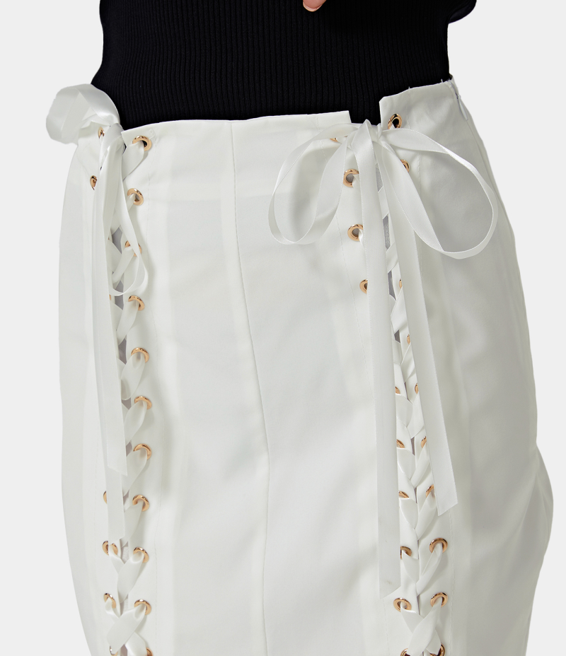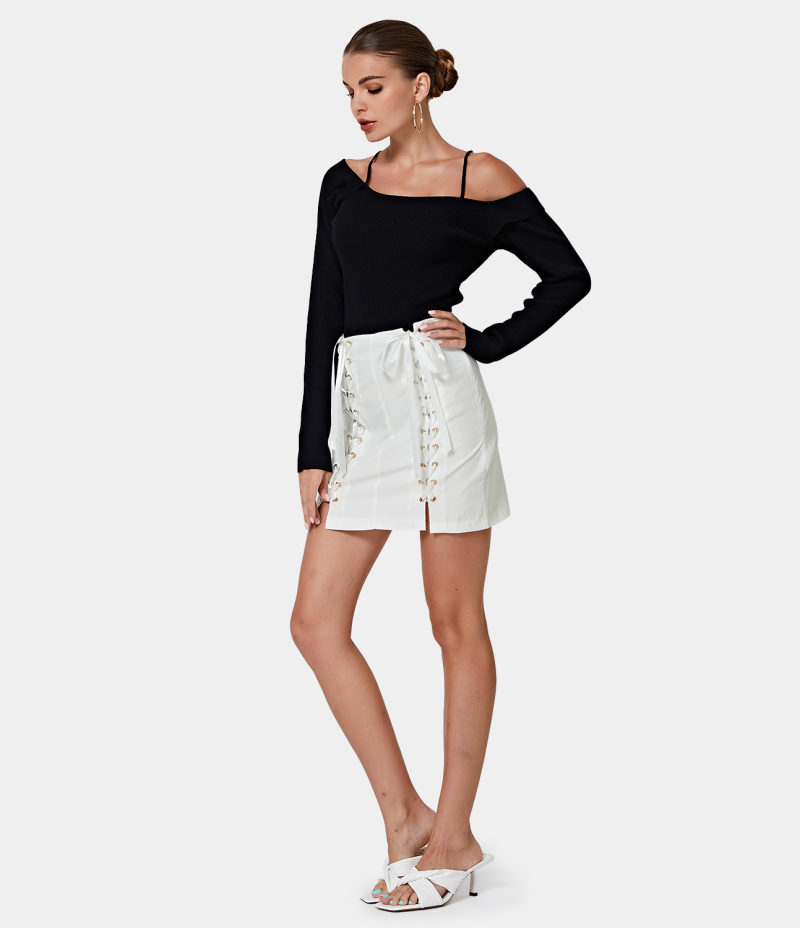 :: Halara High Waisted Lace Up Plain Mini Women's Skirts White | 672853-SGW