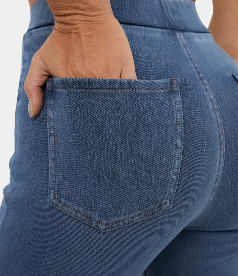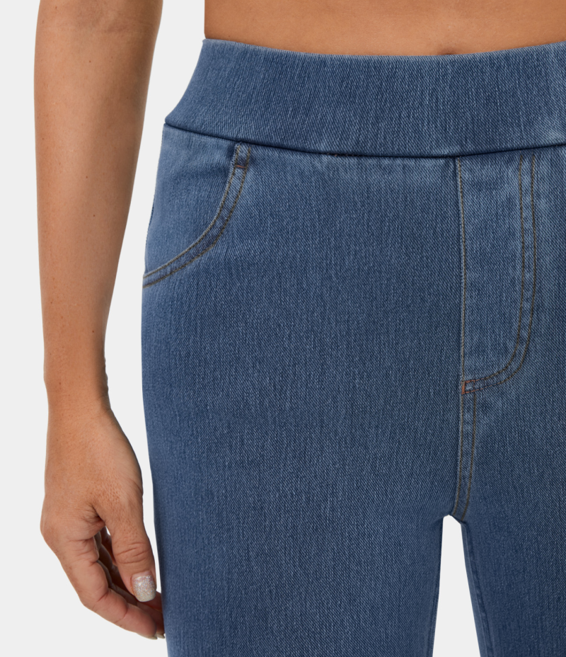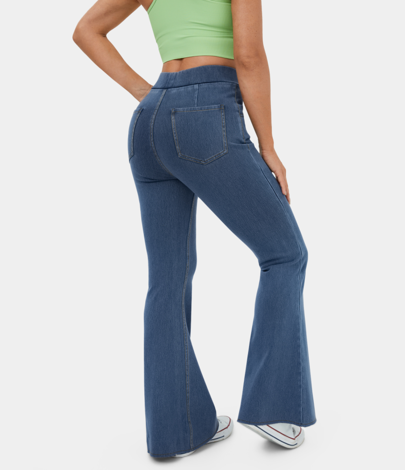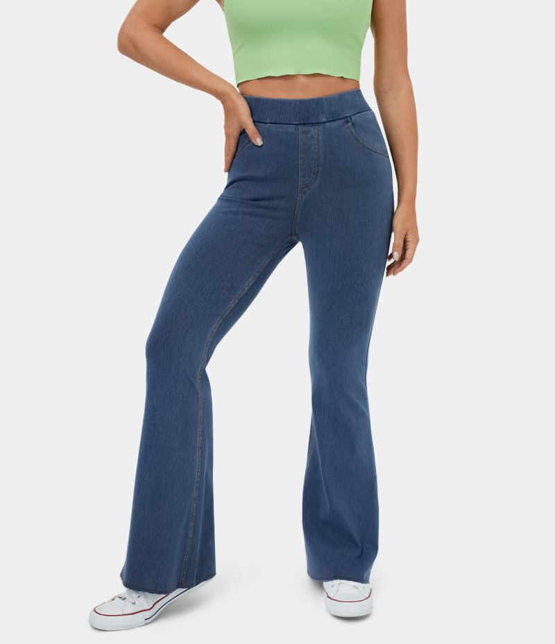 :: Halara High Waisted Pocket Washed Stretchy Knit Denim Casual Super Flare Women's Pants Washed Denim Dark Blue | 504719-JUB