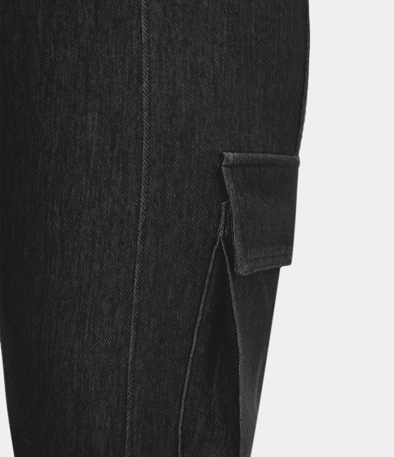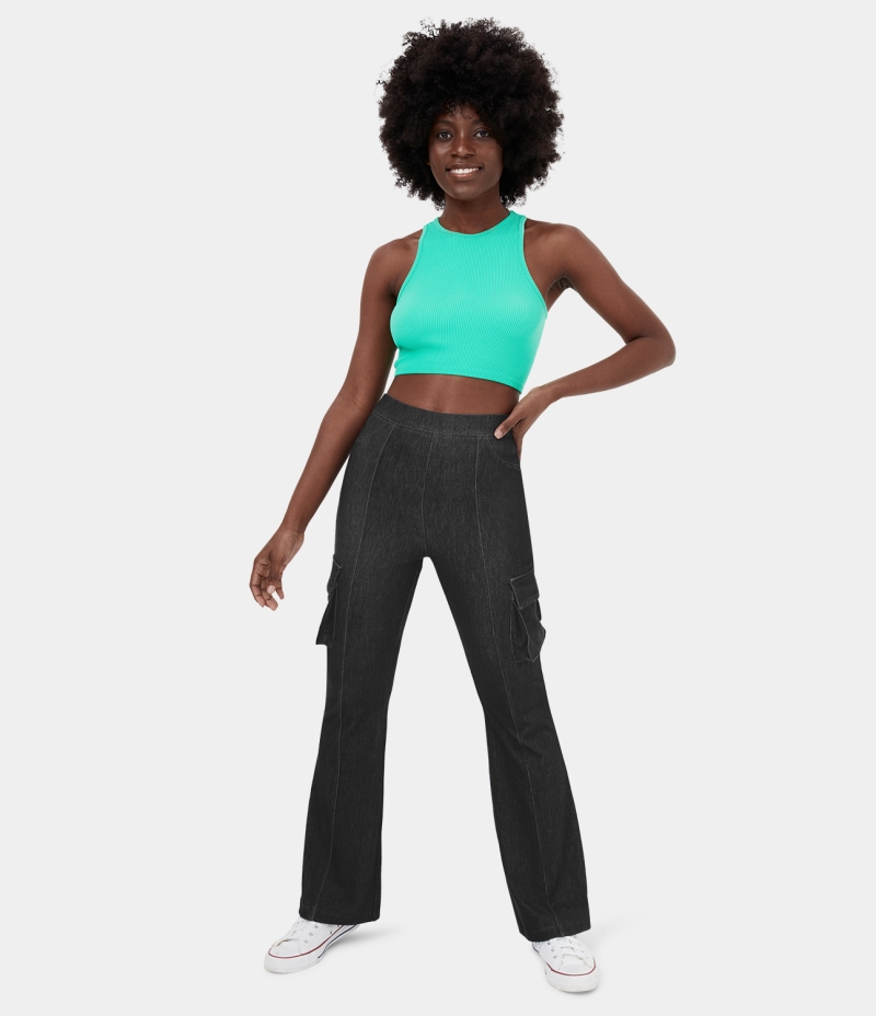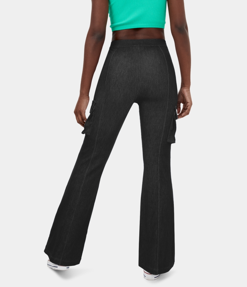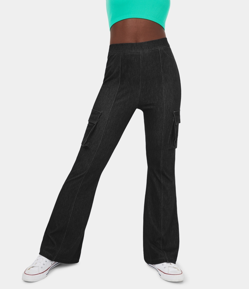 :: Halara High Waisted Side Flap Pocket Stretchy Knit Denim Casual Cargo Flare Women's Pants Black | 581236-GXR