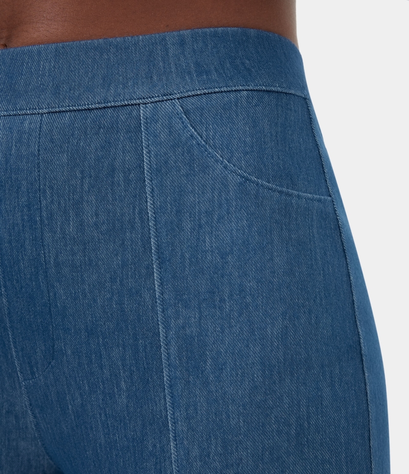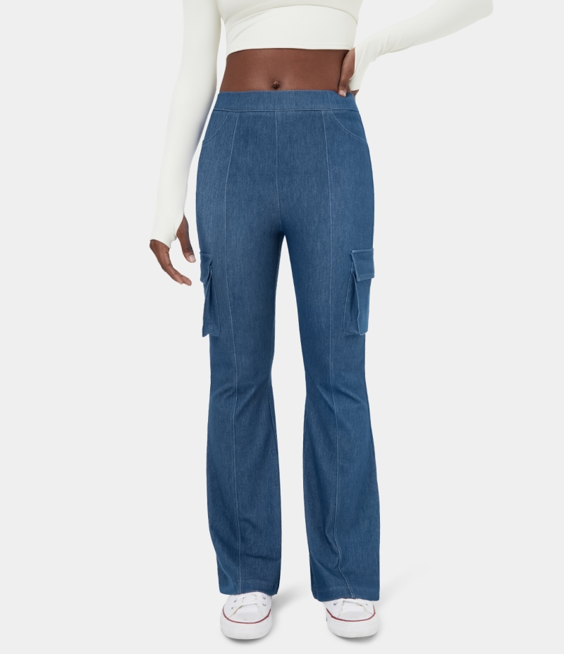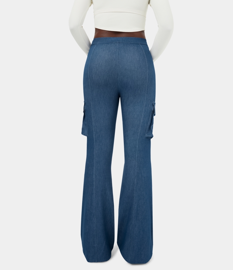 :: Halara High Waisted Side Flap Pocket Stretchy Knit Denim Casual Cargo Flare Women's Pants Paeonia Ocean Blue | 601297-OHV