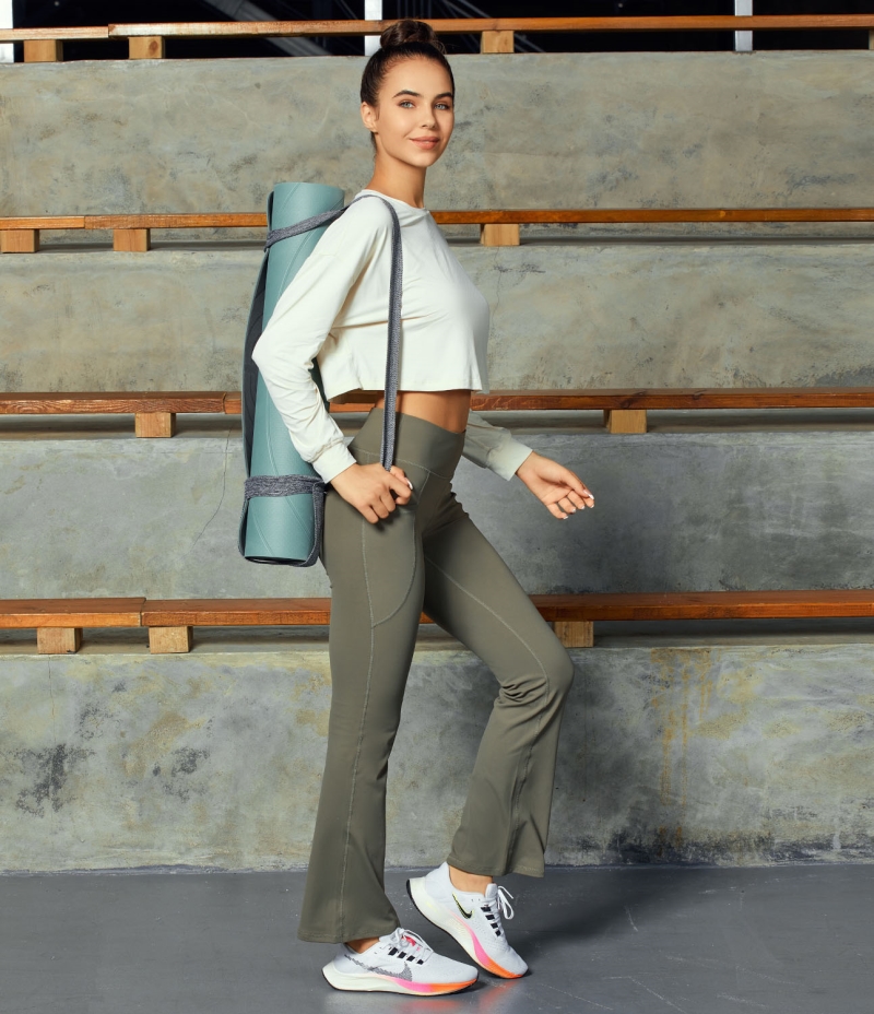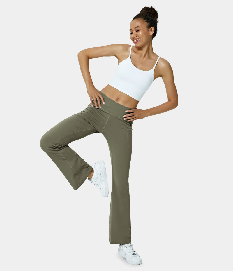 :: Halara High Waisted Side Pocket Slight Flare Women's Leggings Moss Green | 240965-ZYF