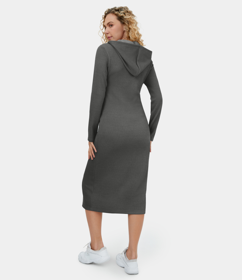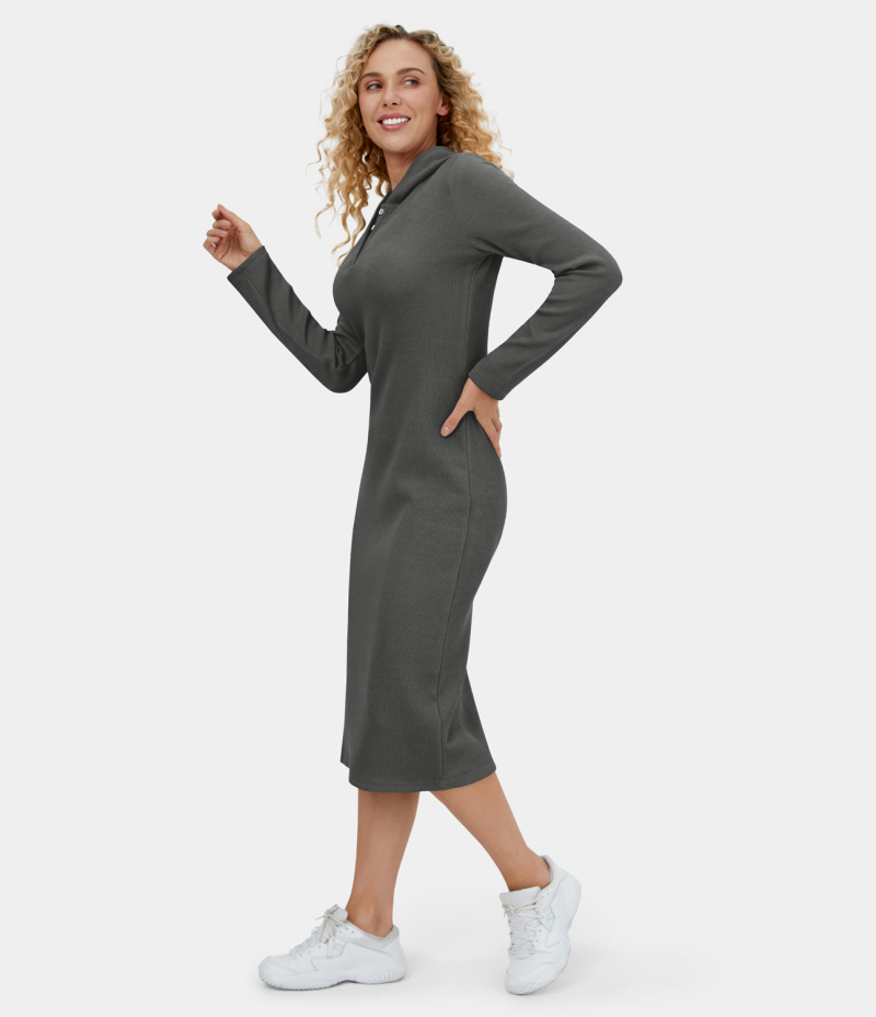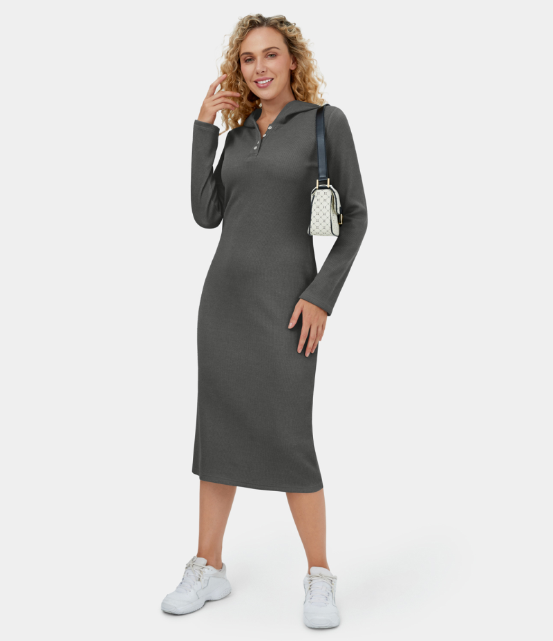 :: Halara Hooded Button Bodycon Midi Casual Women's Dress Ebony | 813792-NJP