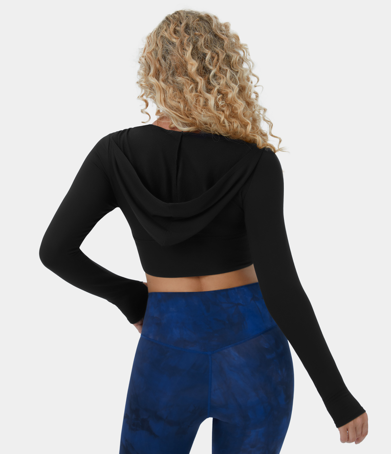 :: Halara Hooded Deep V Neck Thumb Hole Cropped Yoga Sports Sweatshirt Women's Tops Black | SOKPNHF-28