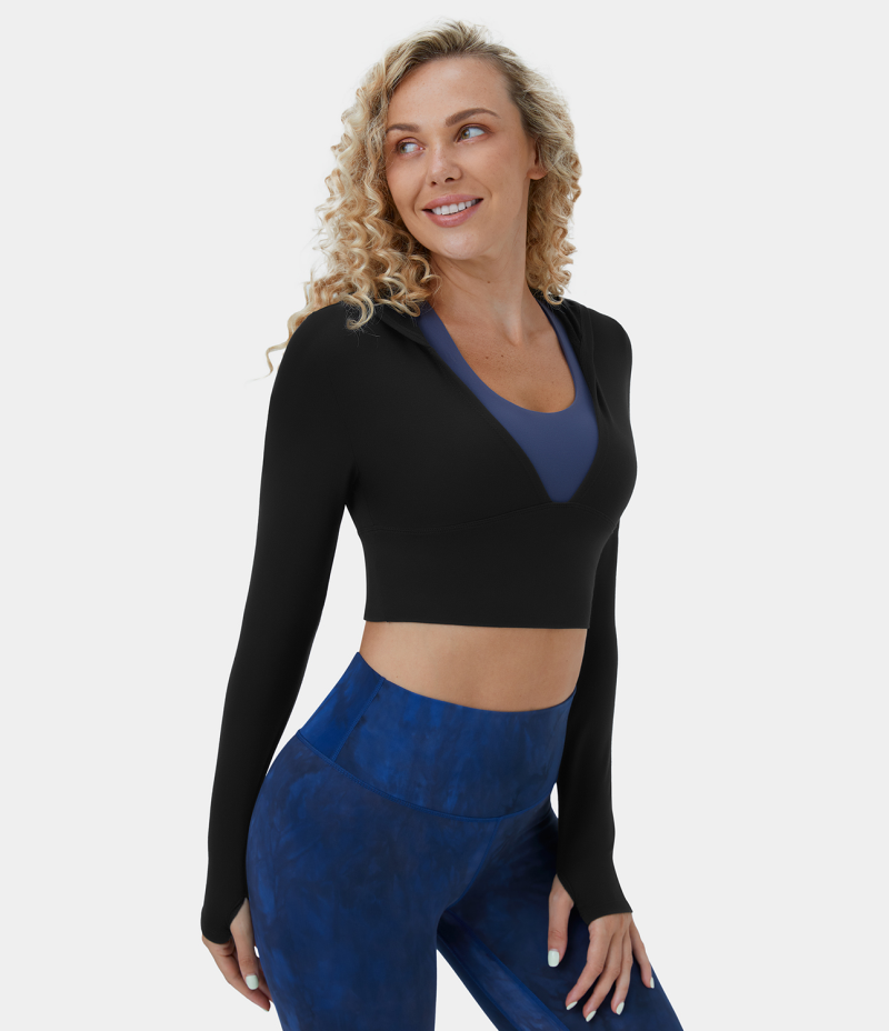 Halara Hooded Deep V Neck Thumb Hole Cropped Yoga Sports Sweatshirt Women's Tops Black | SOKPNHF-28