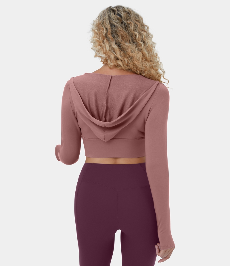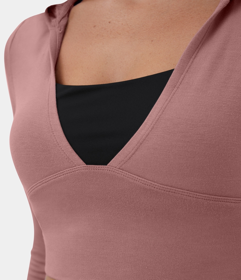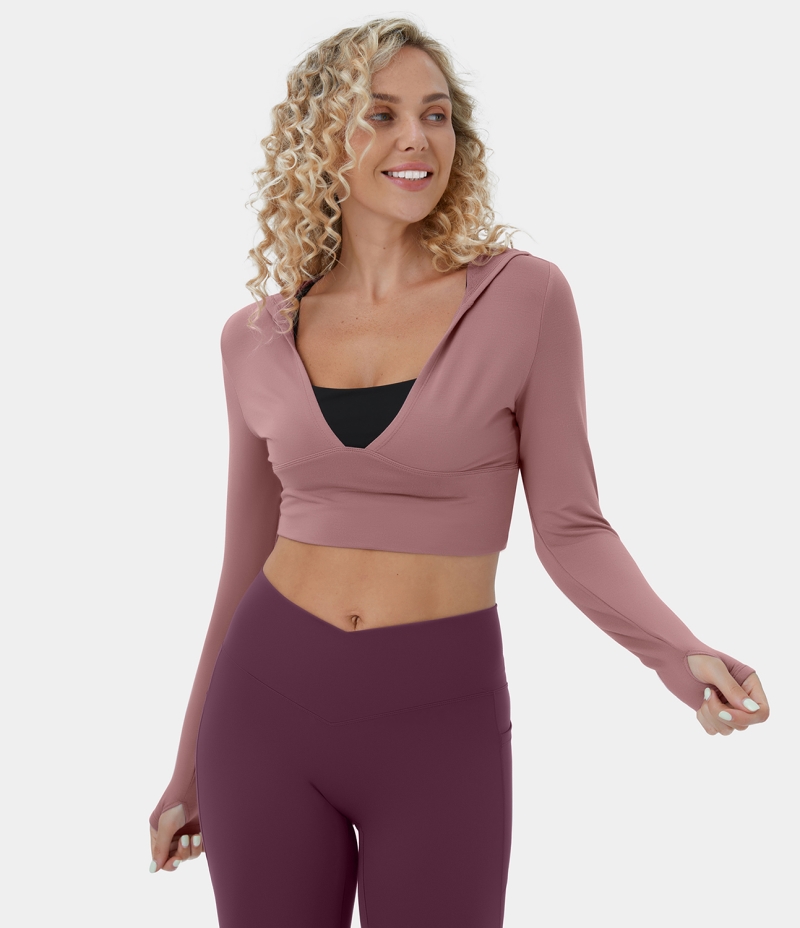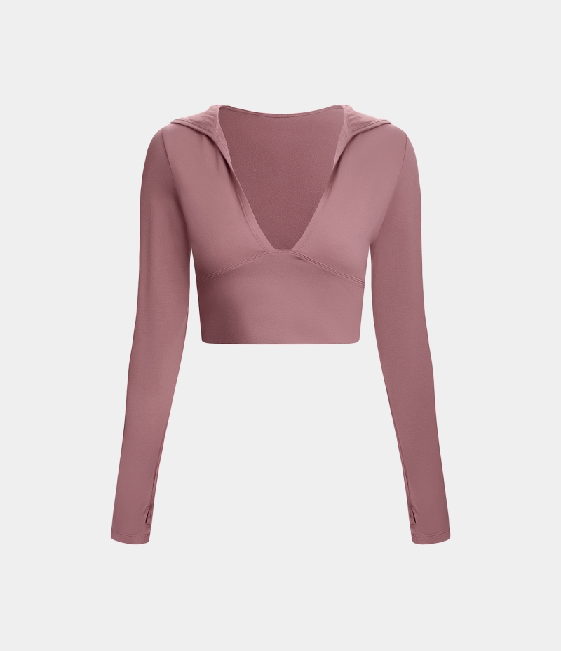 :: Halara Hooded Deep V Neck Thumb Hole Cropped Yoga Sports Sweatshirt Women's Tops Dusty Rose | GQADXKI-46