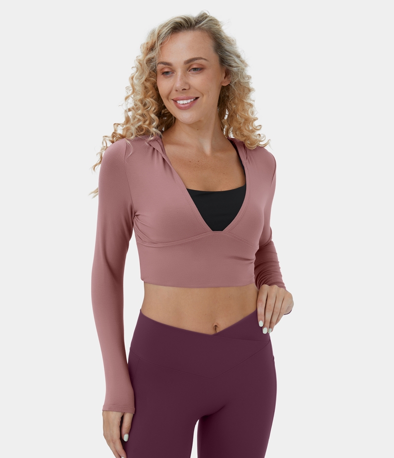 Halara Hooded Deep V Neck Thumb Hole Cropped Yoga Sports Sweatshirt Women's Tops Dusty Rose | GQADXKI-46