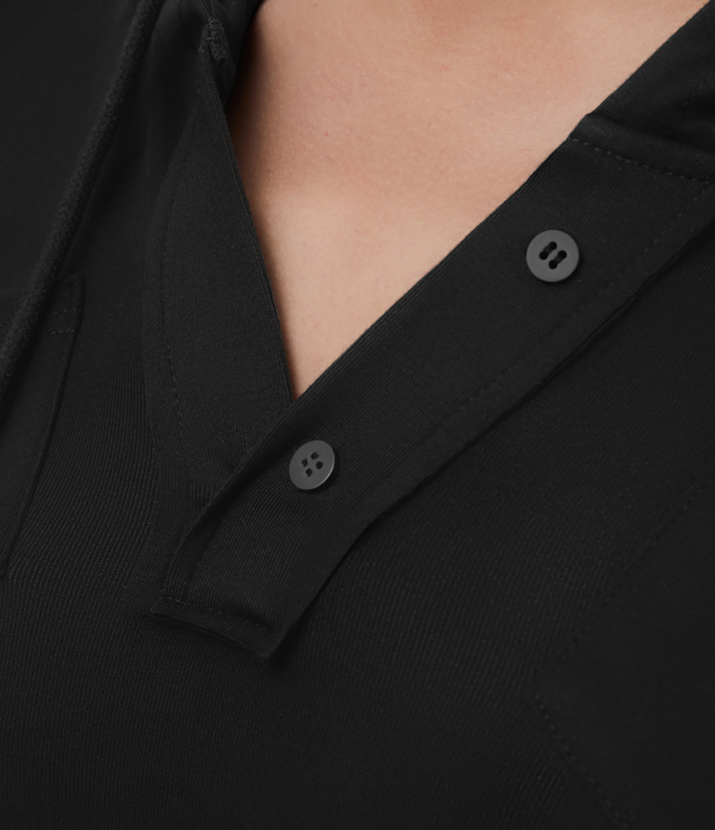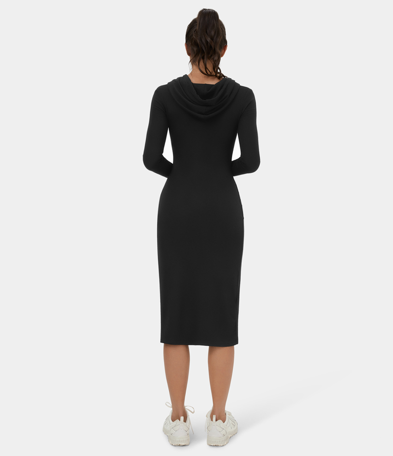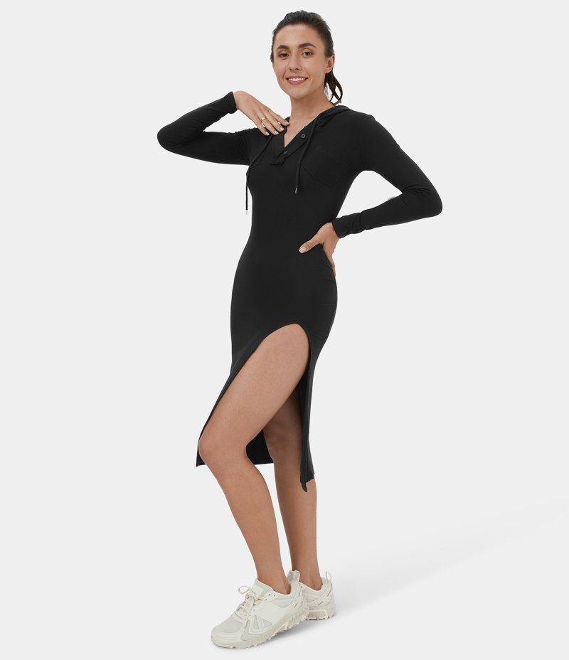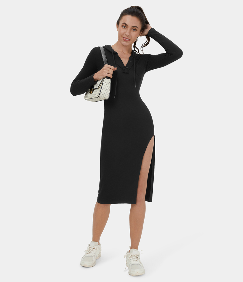 :: Halara Hooded Drawstring Button Pocket Split Bodycon Midi Casual Women's Dress Black | 513809-YOH