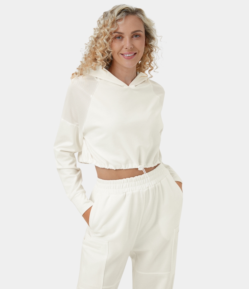 Halara Hooded Drawstring Contrast Mesh Cropped Yoga Sports Sweatshirt Women's Tops White | QJBTOIE-35