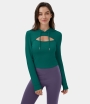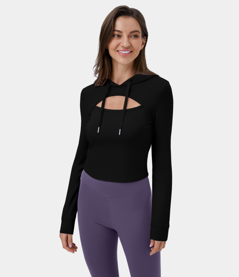 Halara Hooded Drawstring Cut Out Cropped Casual Hoodie Sweatshirt Women's Tops Black | VUGMAYB-85