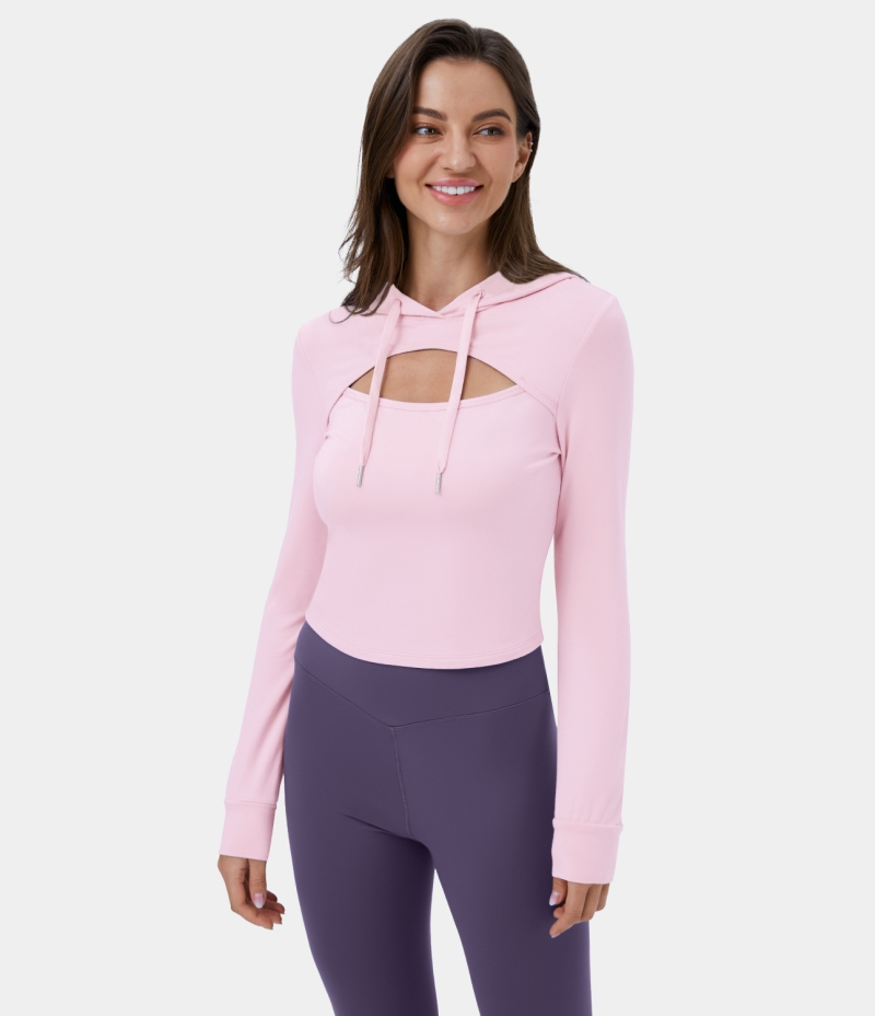 Halara Hooded Drawstring Cut Out Cropped Casual Hoodie Sweatshirt Women's Tops Cradle Pink | LREMTUP-29