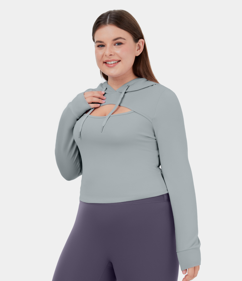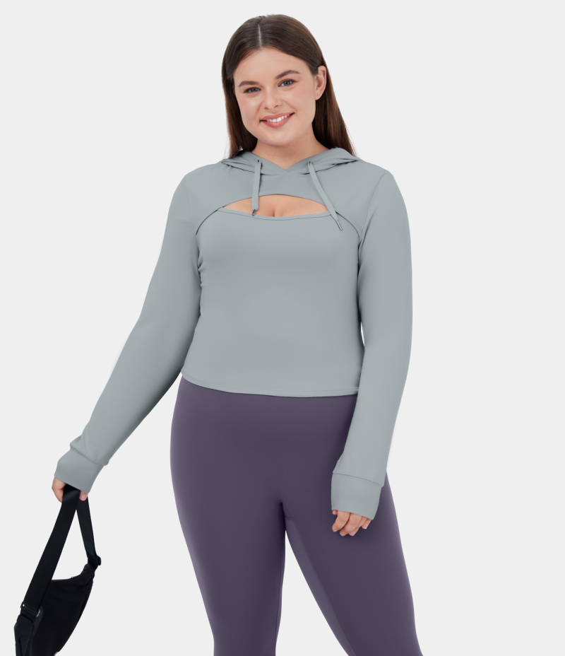 :: Halara Hooded Drawstring Cut Out Plus Size Cropped Casual Hoodie Sweatshirt Women's Tops Grey | QHPUYEM-93