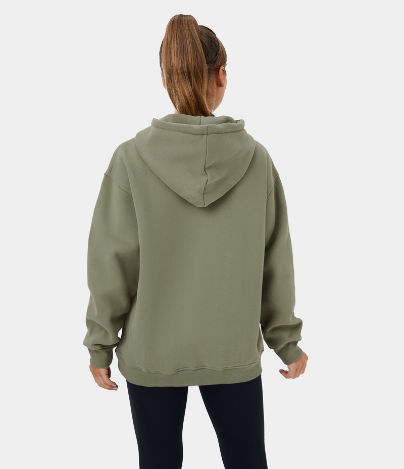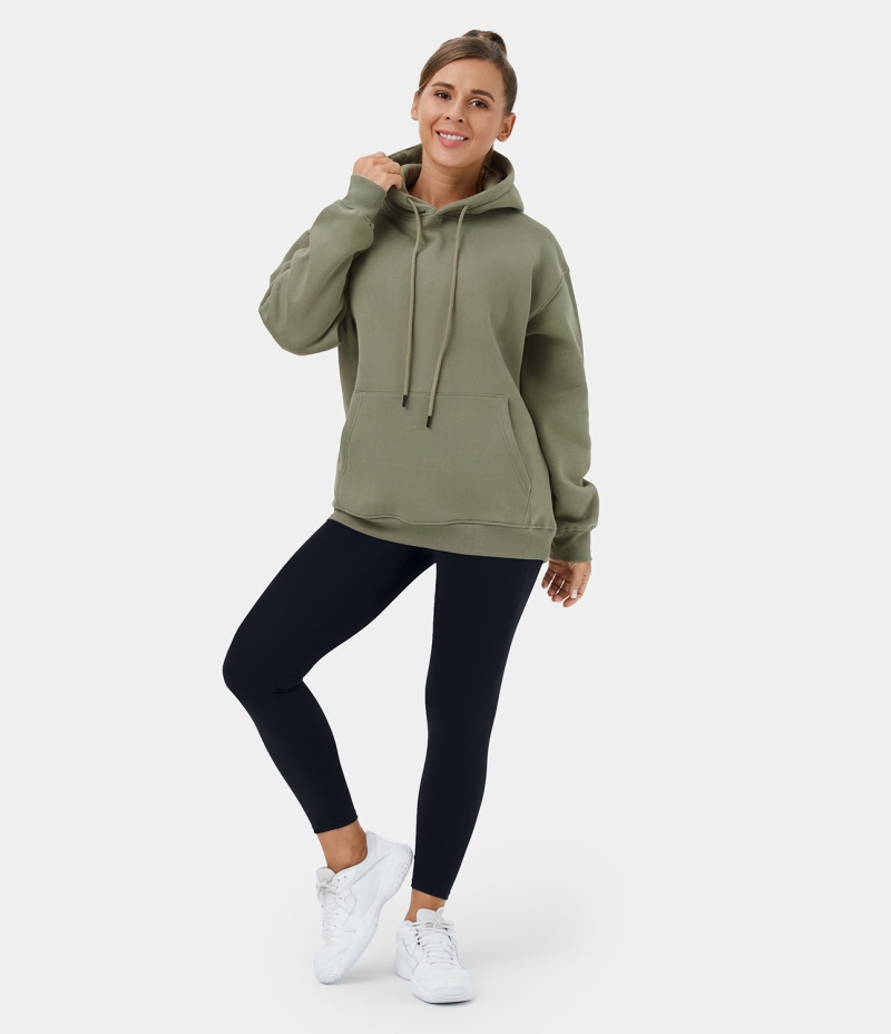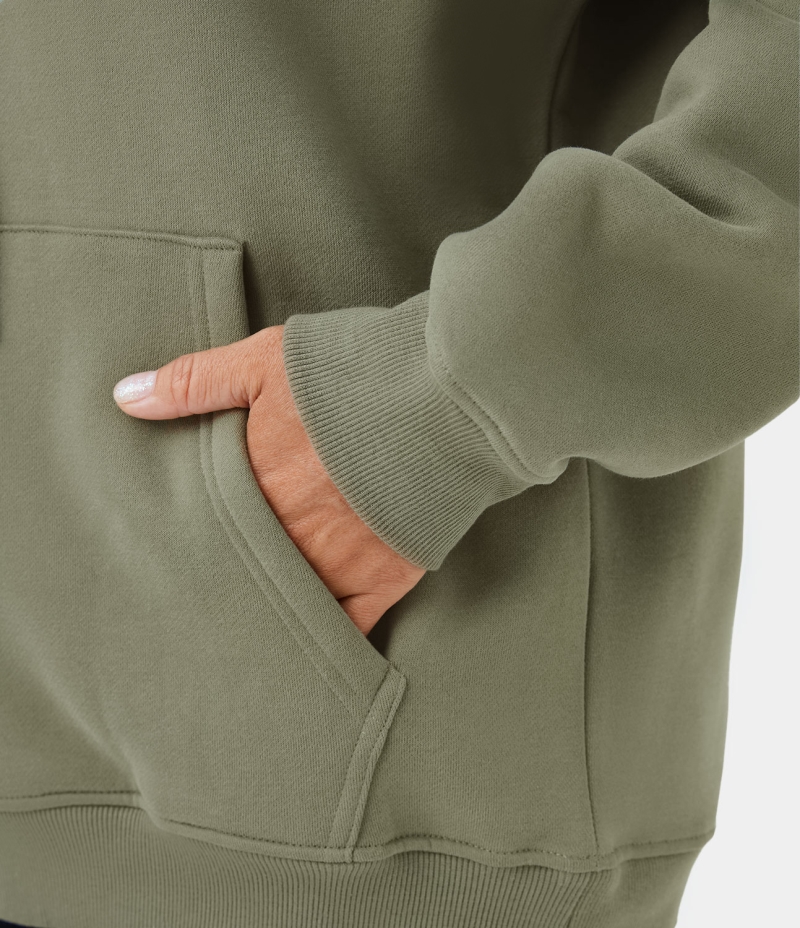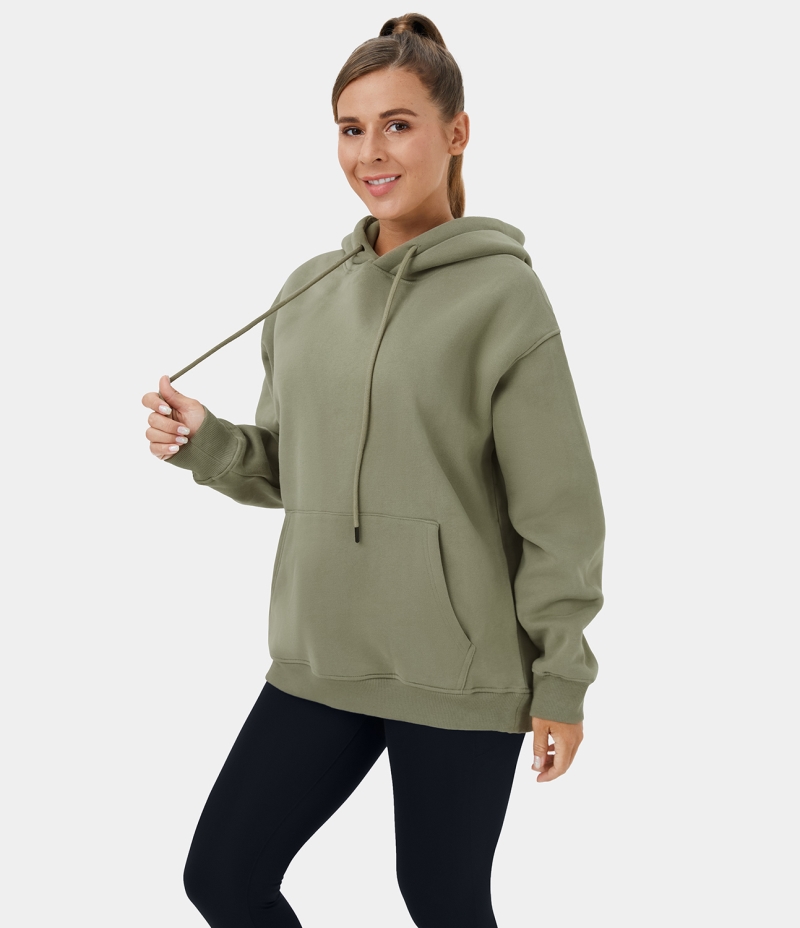 :: Halara Hooded Drawstring Dropped Shoulder Kangaroo Pocket Fleece Hoodie Sweatshirt Women's Tops Oil Green | NQIKTVF-62
