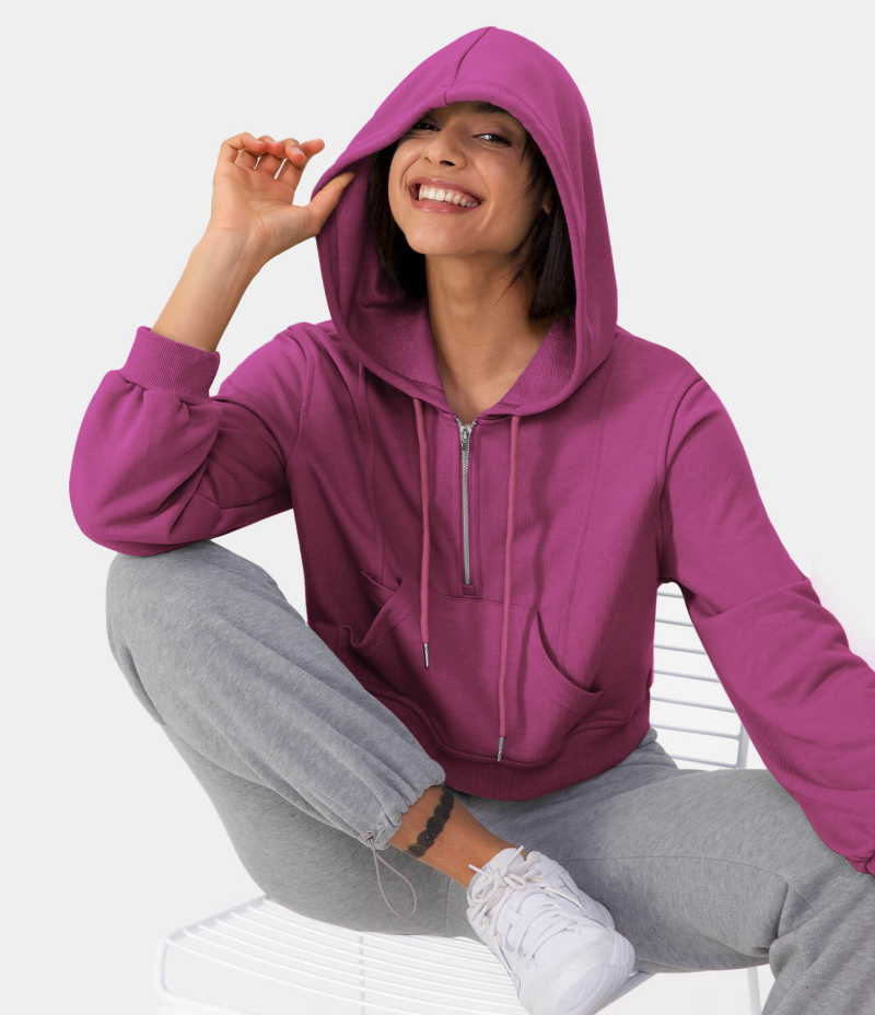 :: Halara Hooded Drawstring Half Zip Kangaroo Pocket Cropped Pullover Hoodie Sweatshirt Women's Tops Red Violet | YDURATQ-57