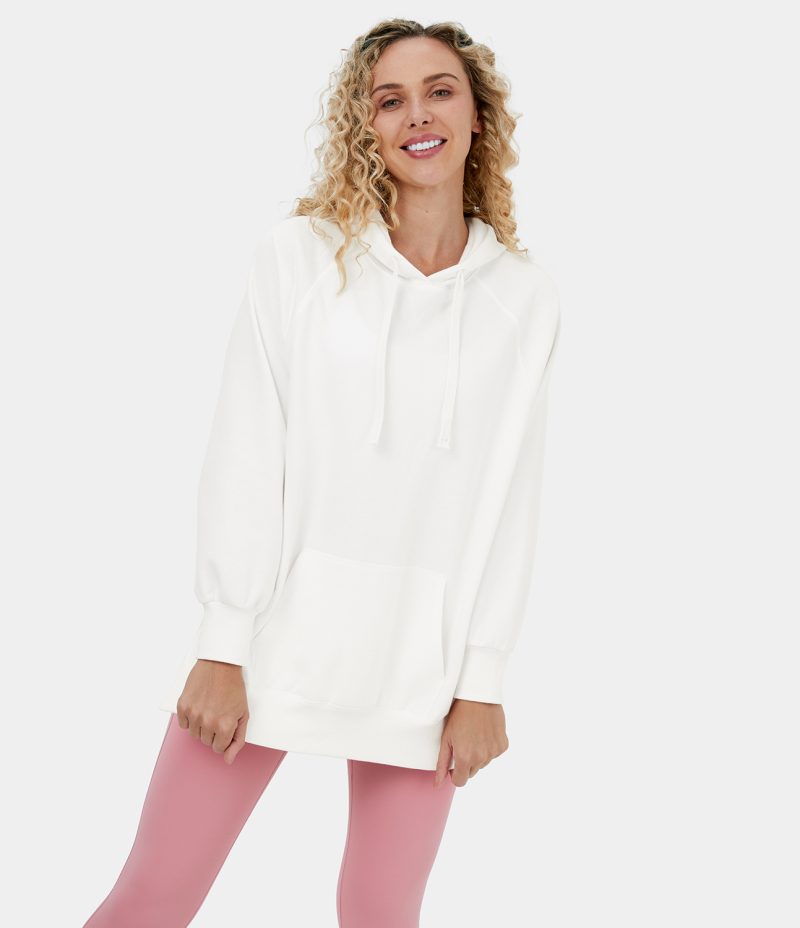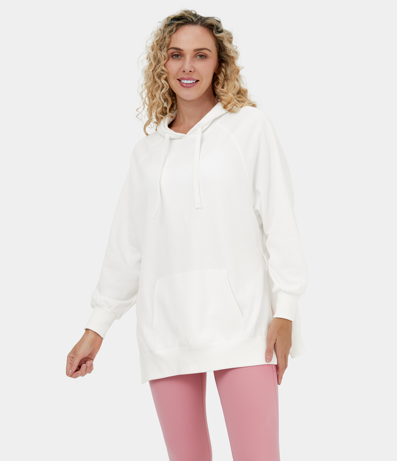 Halara Hooded Drawstring Kangaroo Pocket Side Split Fleece Casual Hoodie Sweatshirt Women's Tops White | HFAGVJP-08