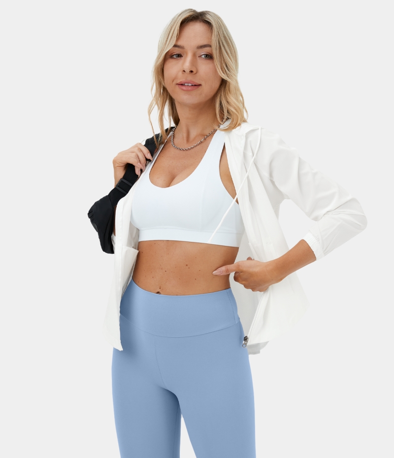 :: Halara Hooded Drawstring Zipper Side Pocket Curved Hem Yoga Jacket Women's Tops White | MBOQICR-63