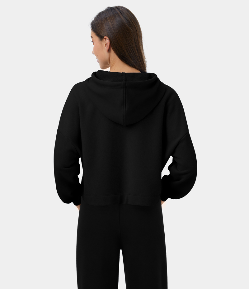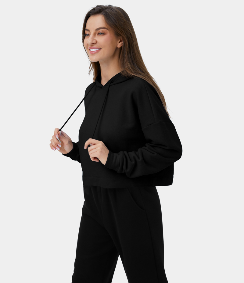 Halara Hooded Dropped Shoulder Drawstring Cropped Fleece Casual Hoodie Sweatshirt Women's Tops Black | HWTCPQN-12