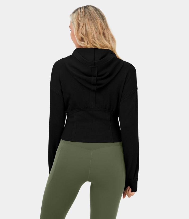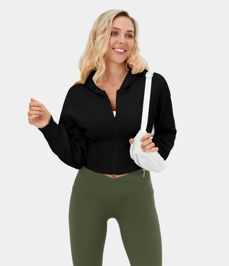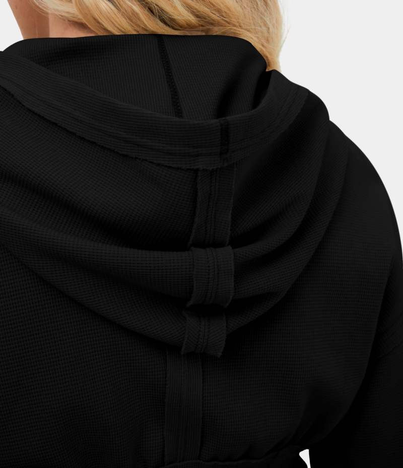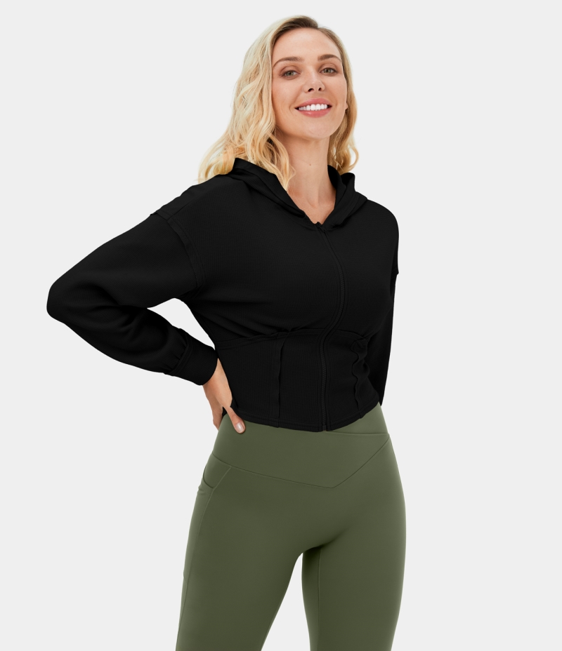 :: Halara Hooded Full Zip Corset Cropped Waffle Casual Hoodie Sweatshirt Women's Tops Black | MDGKBNJ-41