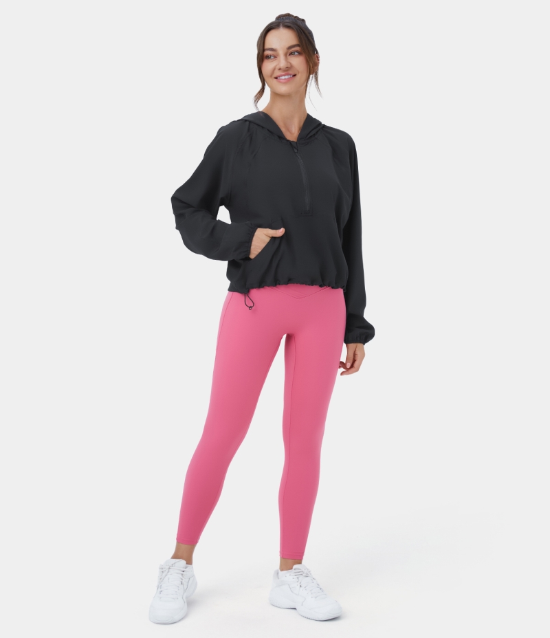 Halara Hooded Half Zip Kangaroo Pocket Drawstring Yoga Jacket Women's Tops Black | KFPXITU-81