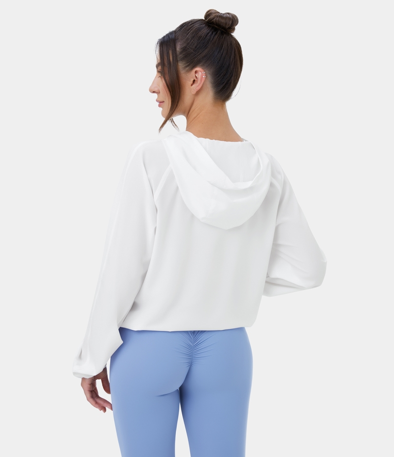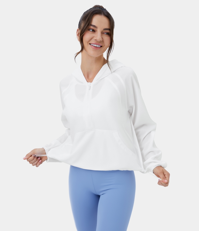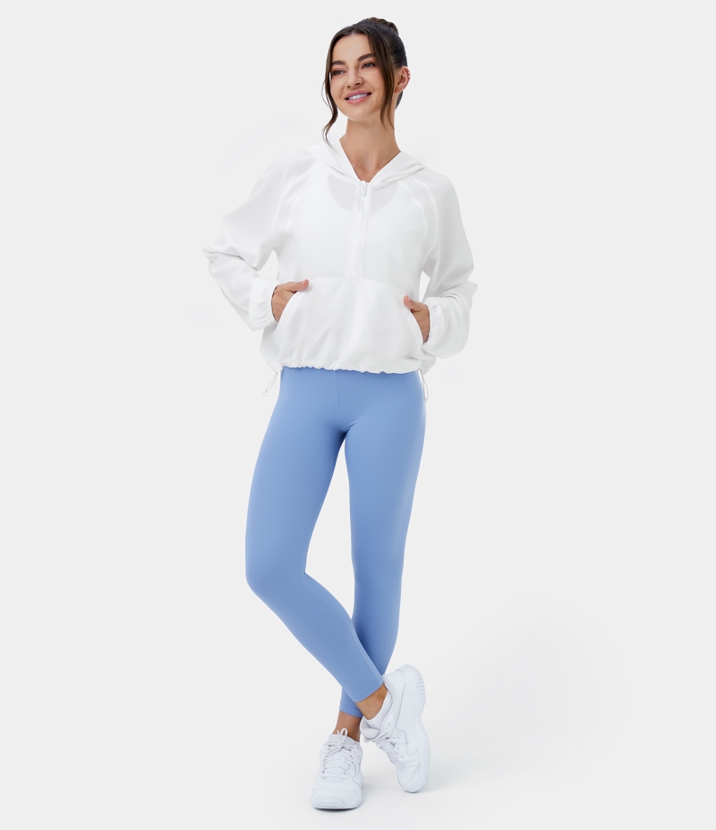 :: Halara Hooded Half Zip Kangaroo Pocket Drawstring Yoga Jacket Women's Tops White | VRMTKHG-60