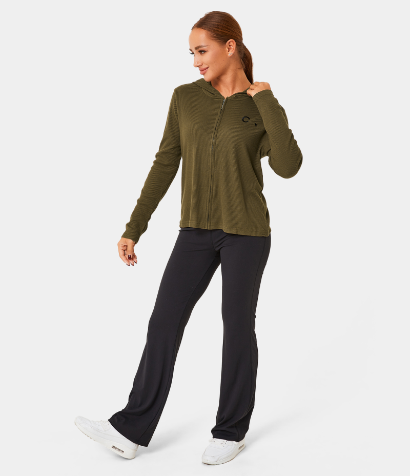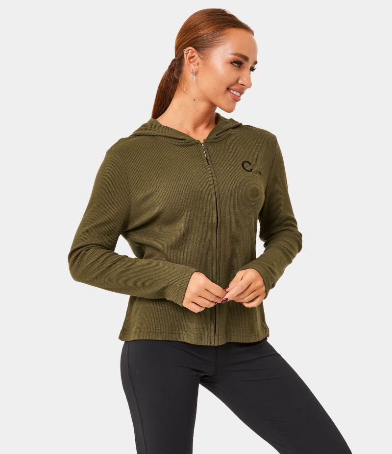 Halara Hooded Zipper Letter Embroidery Plain Ribbed Jacket Women's Tops Golden Granola | IMNHLPY-09